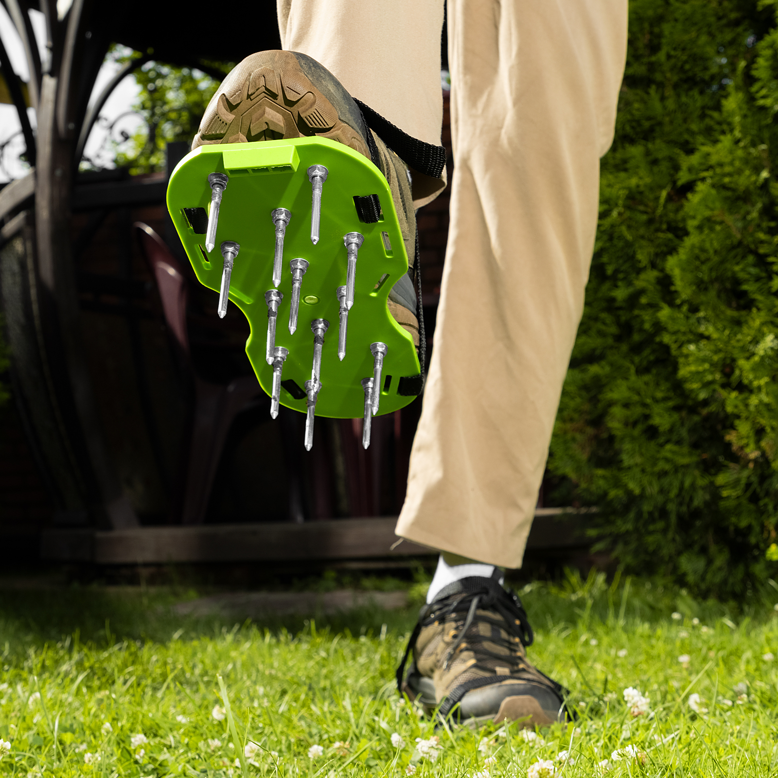 - Удобное использование — аэратор выполнен в форме платформ для ног с длинными стержнями, достаточно надеть их и походить по участку.