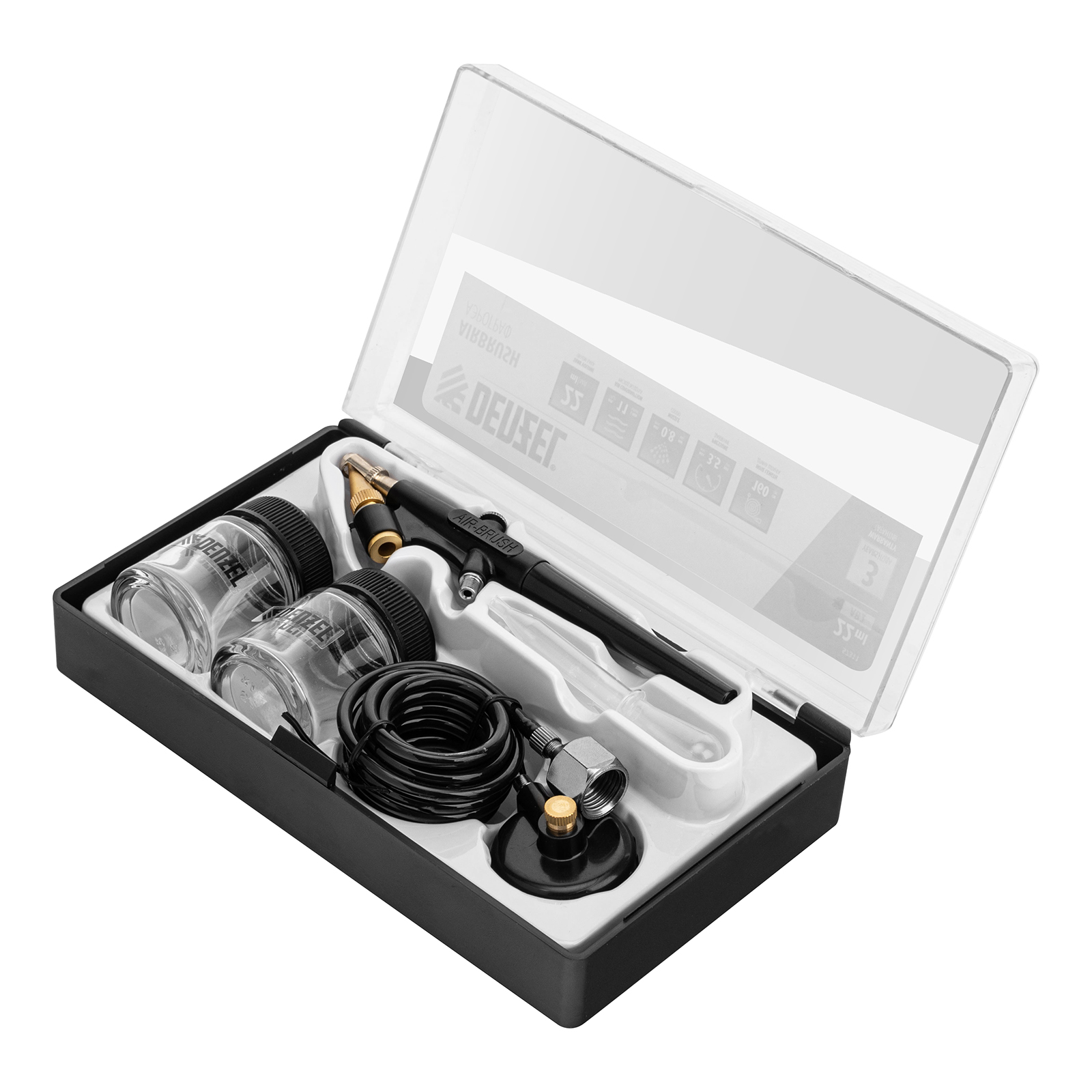 Аэрограф - 1 штДозатор - 1 штБачок - 2 штШланг для аэрографа - 1 штКрышка-переходник - 1 штКейс - 1 штРуководство по эксплуатации и гарантийный талон - 1 шт |