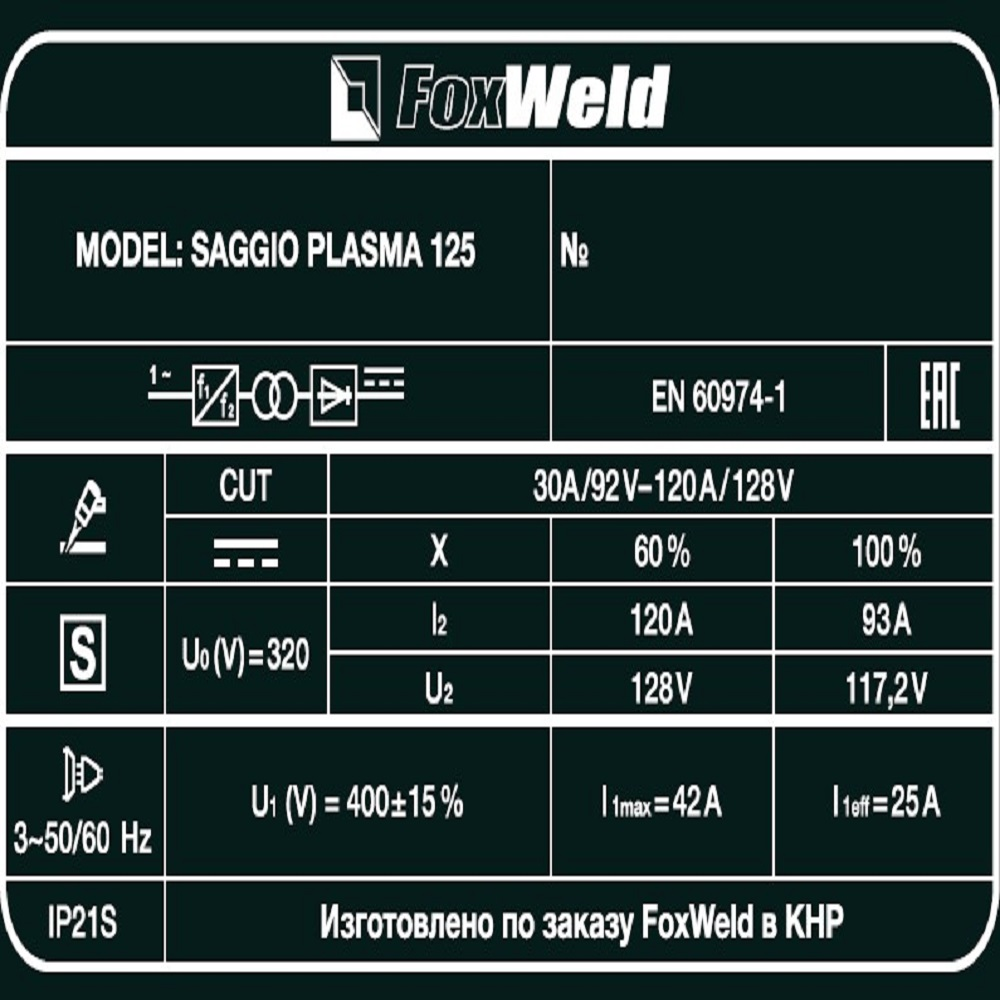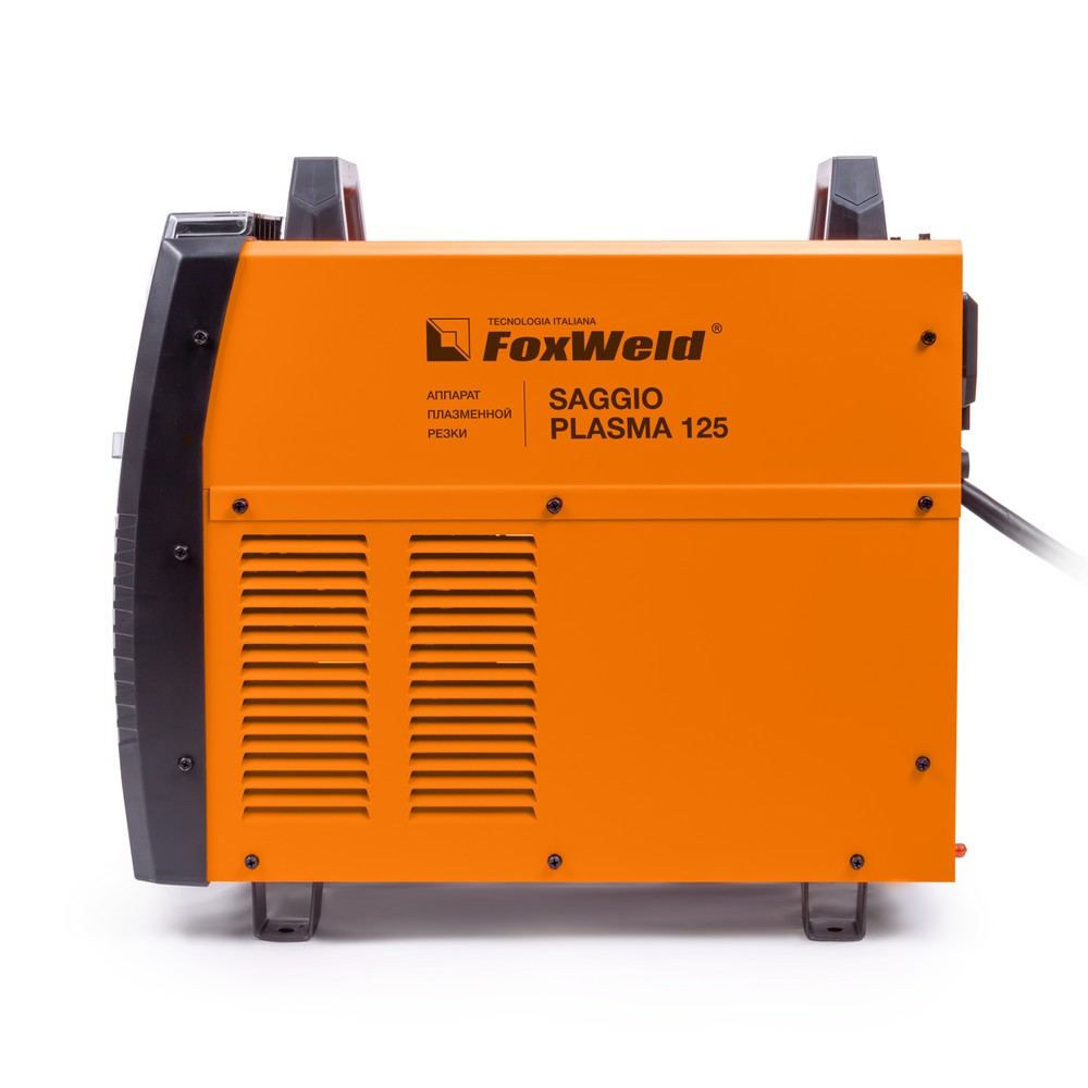 Аппарат плазменной резки FOXWELD SAGGIO PLASMA 125 позволяет разрезать сталь толщиной до 40 мм. SAGGIO PLASMA 125 подходит для резки алюминиевых сплавов, меди, цветных металлов, нержавеющей и углеродистой стали. Дежурная дуга плазмотрона обеспечивает стабильность и удобство, особенно при резке загрязнённых и окрашенных поверхностей. Цифровой дисплей на панели управления отображает установленные значения тока резки. Режимы работы плазмотрона 2Т / 4Т подходят для короткого и длинного реза. Продувка сжатым воздухом после окончания работ с помощью ручки-регулятора увеличивает срок службы комплектующих частей плазмотрона. ДЕЖУРНАЯ ДУГА: Дежурная дуга плазмотрона (PILOT ARC) – это первичная дуга между электродом и соплом, которая направляется за счёт сжатого воздуха к поверхности. В момент контакта с разрезаемым материалом дежурная дуга гаснет и загорается режущая дуга, что обеспечивает «доступ» режущей дуги к основному материалу. Благодаря этому плазменная струя не гаснет даже на металлической сетке. Аппарат с дежурной дугой отлично подойдёт для резки сеток, загрязнённых, окрашенных и перфорированных поверхностей.ТОЛЩИНА РЕЗА ДО 40 ММ: Благодаря высоким динамическим характеристикам дуги и стабильному току резки аппарат способен разрезать металл толщиной до 40 мм.ПОДКЛЮЧЕНИЕ К ЧПУ: Возможность подключения к электронному блоку управления позволяет автоматизировать рабочий процесс и контролировать плазменную дугу с помощью автоматического режущего оборудования (ЧПУ) для сложной формы реза и деталей с разной толщиной.РЕЖИМ 2Т / 4Т: Двухтактный режим подходит для короткого реза: при удерживании кнопки на плазмотроне начинается процесс резки, при отпускании – заканчивается. Четырёхтактный режим предназначен для длинного реза: при кратковременном нажатии и отпускании кнопки начинается процесс резки, при повторном кратковременном нажатии и отпускании – заканчивается.ЦИФРОВОЙ ДИСПЛЕЙ: Цифровой дисплей на панели управления отображает установленные значения тока резки.ПРЕИМУЩЕСТВА:Цифровой дисплейДежурная дуга плазмотронаВозможность подключения к станкам ЧПУРежим работы плазмотрона 2Т / 4ТПостпродувка плазмотронаЗащитная крышка панели управленияФУНКЦИОНАЛЬНЫЕ ОСОБЕННОСТИ:ЗАЩИТА ПЕРЕДНЕЙ ПАНЕЛИ: Прозрачная пластиковая крышка защищает панель управления аппарата от искр, шлака и других воздействий рабочего процесса.ТАБЛИЦА ПОДБОРА КОМПРЕССОРОВ: В таблице ниже - рекомендации по подбору нужного компрессора.КОМПЛЕКТАЦИЯ: Аппарат плазменной резки SAGGIO PLASMA 125 – 1 шт.; Плазмотрон A-141, 6 м – 1 шт.; Кабель заземления с зажимом, 3 м – 1 шт.; Узел подготовки воздуха со скобой для крепления – 1 шт.; Штуцер для подсоединения узла подготовки воздуха – 2 шт.; ФУМ-лента – 1 шт.; Газовый шланг, 3 м – 1 шт.; Комплект переходников (2-pin 1 шт., 4-pin 1 шт.) для подключения к станку плазменной резки – 1 компл.; Катод PR0101 – 2 шт.; Сопло PD0101-17 – 2 шт.; Насадка защитная (для плазмотрона) – 1 шт.; Хомут для шланга – 4 шт.; Ключ – 1 шт.; Инструкция + гарантийный талон – 1 компл.*Производитель оставляет за собой право менять комплектацию оборудования.