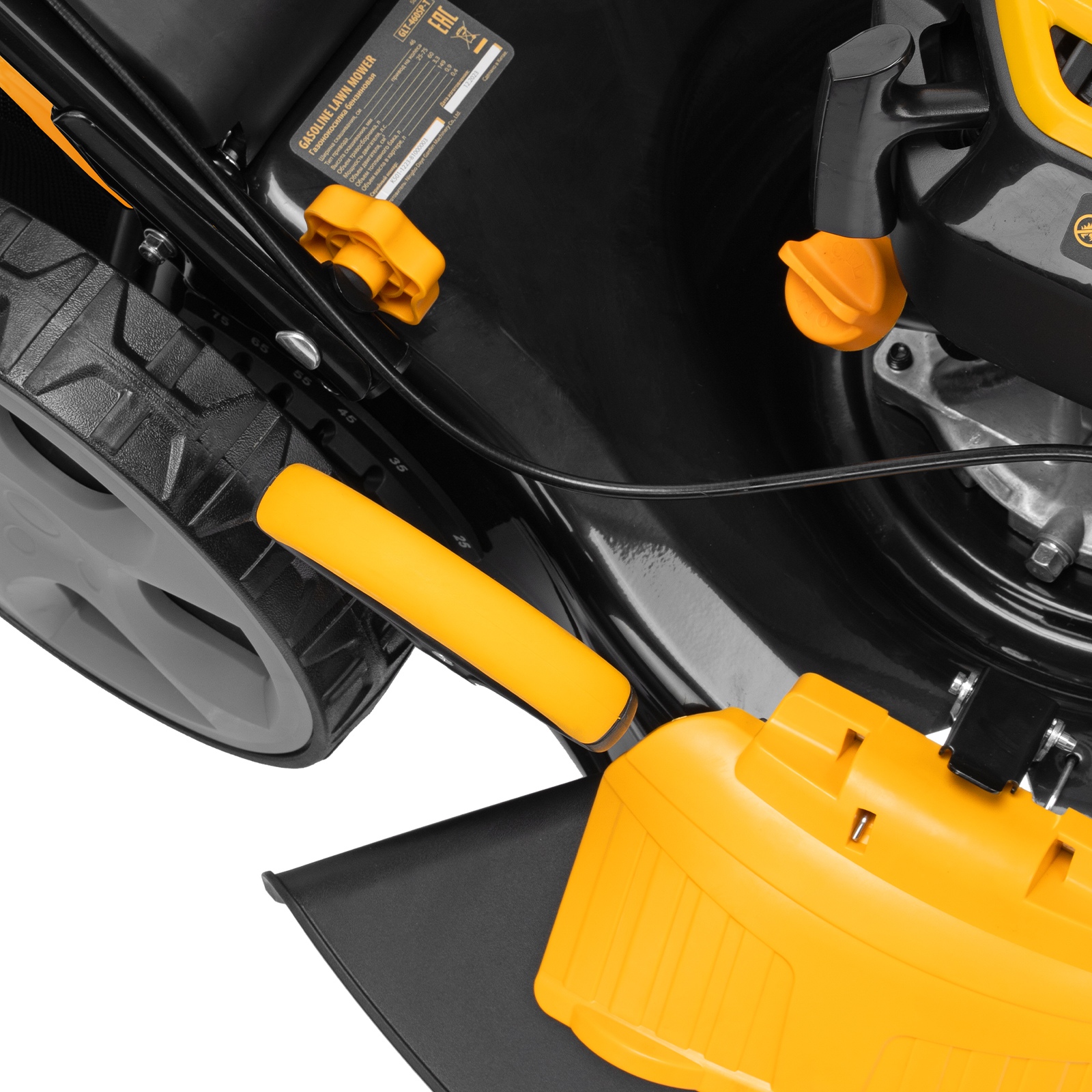 - Комфортная работа — угол наклона рукоятки регулируется в соответствии с ростом пользователя, на панели управления предусмотрен подстаканник, поэтому можно не расставаться с любимым напитком во время кошения.