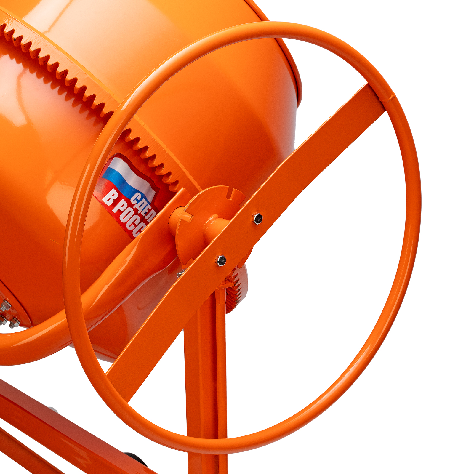 - Прочная конструкция — стальные подкосы придают опорной стойке жесткость и обеспечивают устойчивое положение работающего бетоносмесителя.