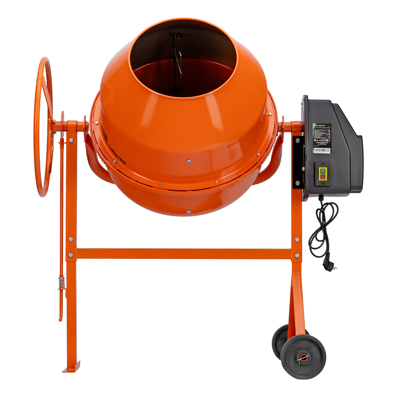 - Удобная загрузка и выгрузка смеси — барабан наклоняется при помощи маховика и легко фиксируется в нужном положении.