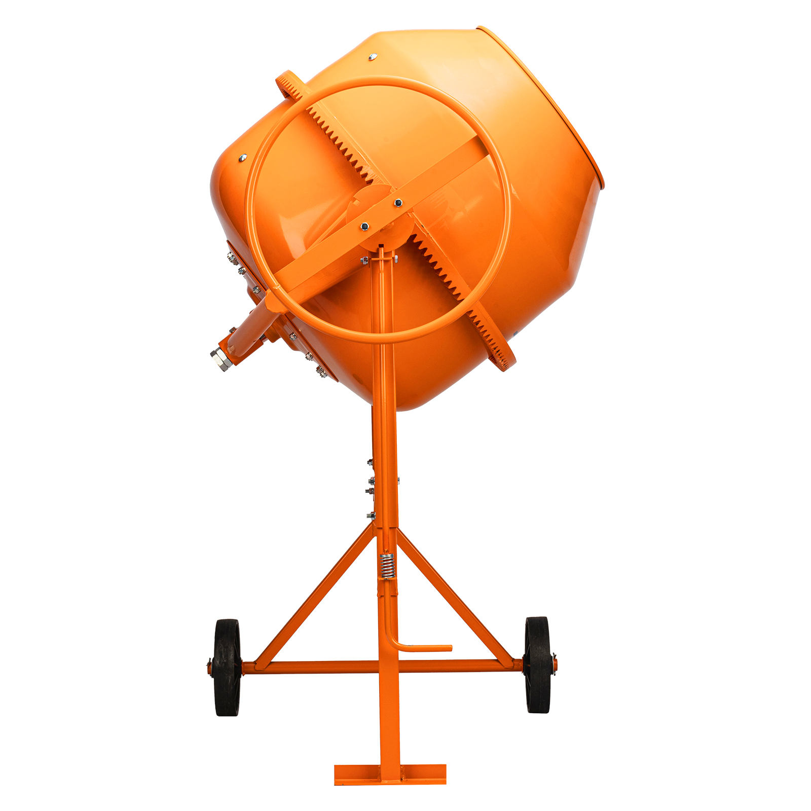 - Продуманная конструкция — опорная втулка оси траверсы выполнена отдельным элементом и приварена к раме, венец крепится к баку с помощью выносных проушин, а металлическая опора обеспечивает устойчивость бетоносмесителя.