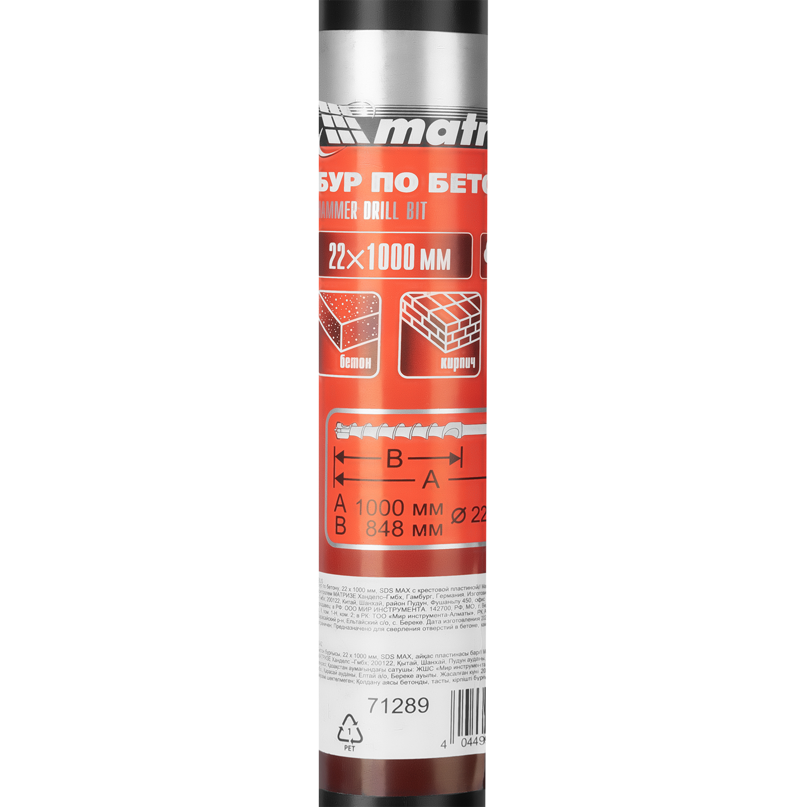 Бур по бетону Matrix 71289 размером 22 х 1000 мм используется в качестве оснастки на тяжелых перфораторах с хвостовиком SDS MAX. Подходит для сверления глубоких отверстий в кирпиче и особо прочных материалах: армированном бетоне, природном и искусственном камне.
