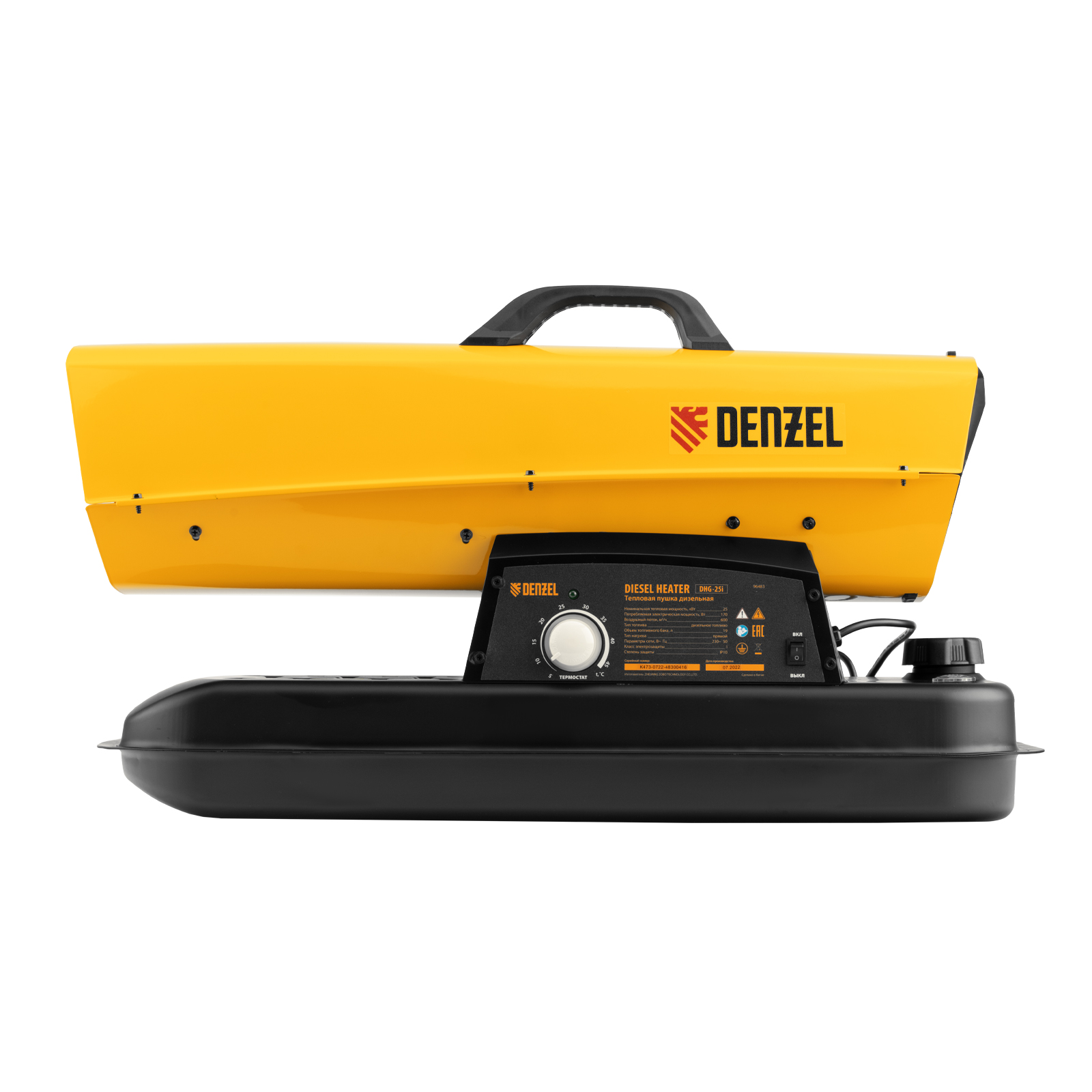 Дизельная тепловая пушка Denzel DHG-25i 96483 номинальной тепловой мощностью 25 кВт и производительностью 600 куб. м/ч, с прямым типом нагрева, с электронным термостатом, предназначена для обогрева цехов, складов, теплиц и других нежилых помещений. Используется в строительстве и на производстве. Пушка характеризуется низким расходом топлива: полного бака хватает на 10 часов работы. Важно: в обогреваемом помещении необходимо обеспечить хорошую вентиляцию.