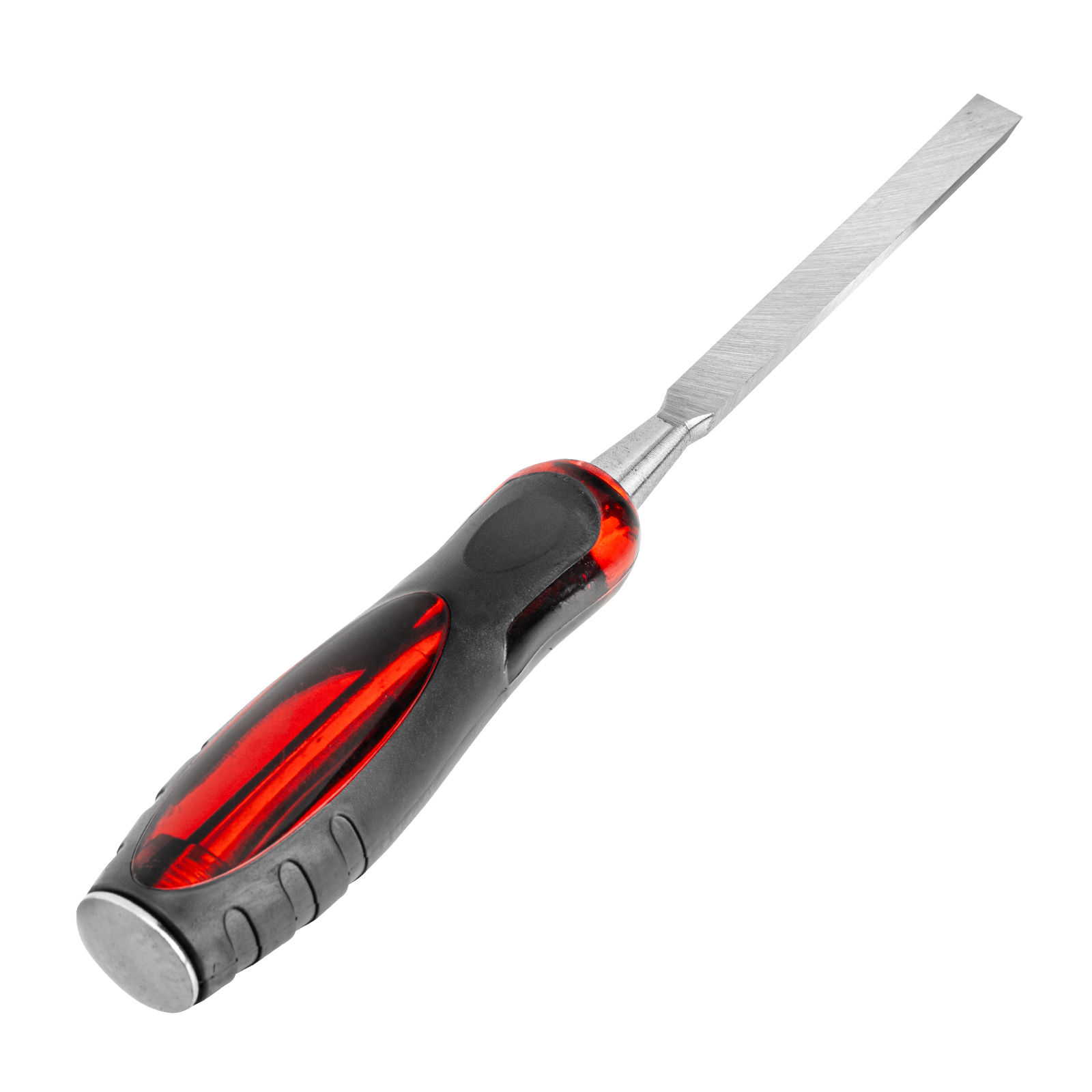 - Длительное сохранение режущих свойств — долото-стамеска обладает твердостью 65 HRC (0,7 длины рабочей части полотна), острое, как бритва, лезвие обработано на заводе под углом 20-35°, повторная заточка потребуется минимум через 6 месяцев.