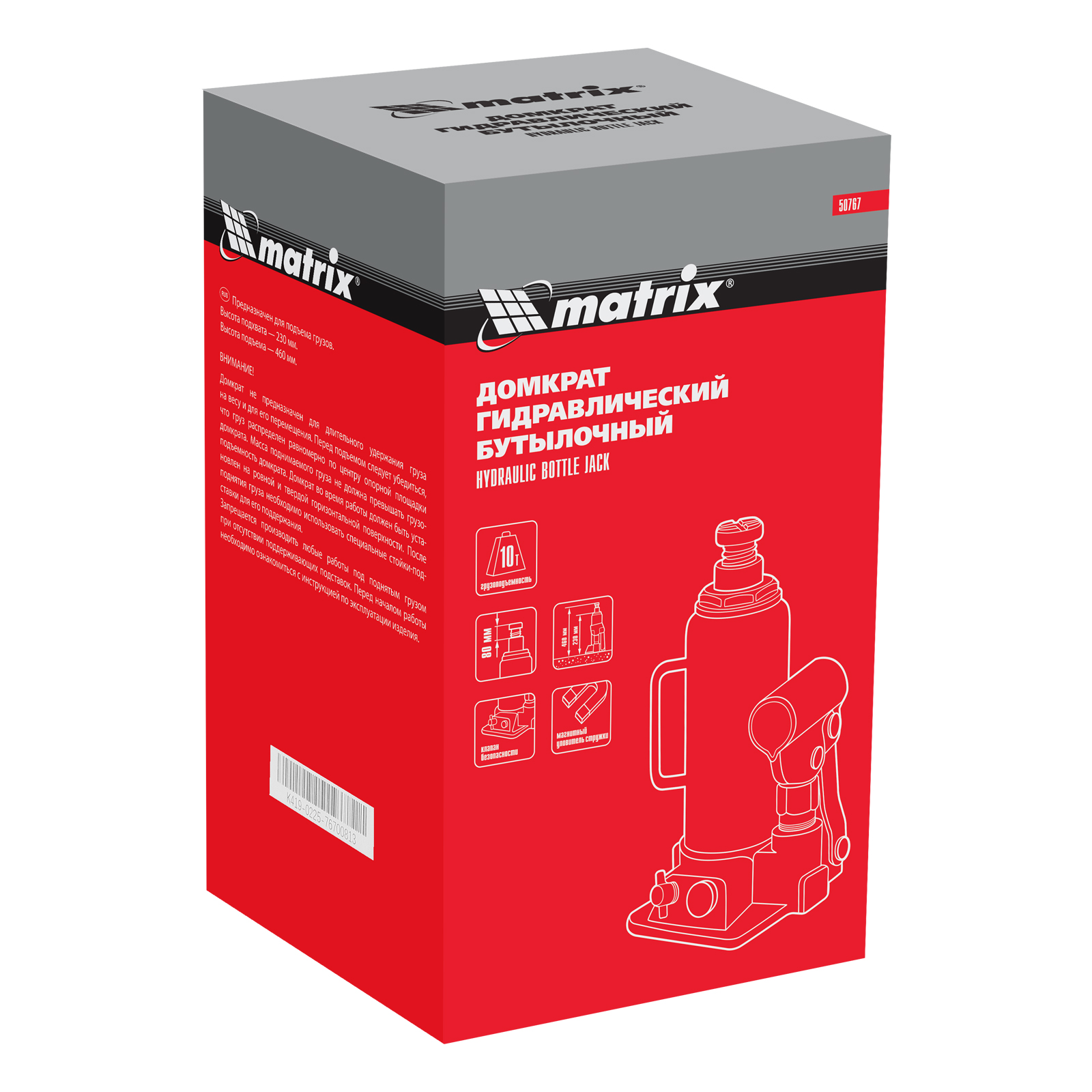 Гидравлический бутылочный домкрат Matrix 50767 предназначен для быстрого поднятия грузов массой до 10 т на высоту 230-460 мм. Будет полезен автолюбителям и мастерам СТО в качестве полупрофессионального инструмента. Встроенный магнитный уловитель металлической стружки защищает резиновые уплотнители от повреждений.