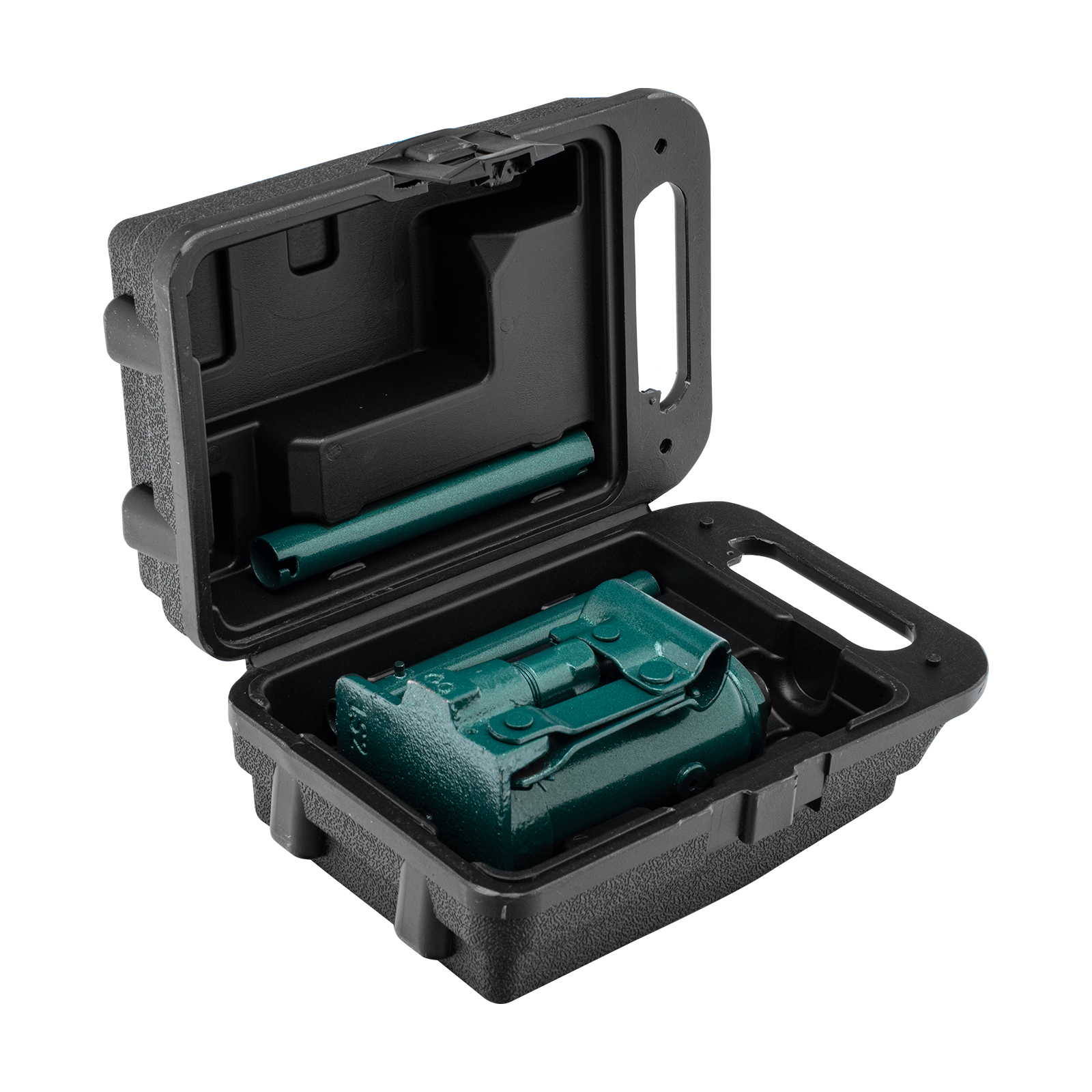- Удобное хранение и транспортировка — домкрат весит всего 1,9 кг и поставляется в прочном пластиковом кейсе с рукояткой.