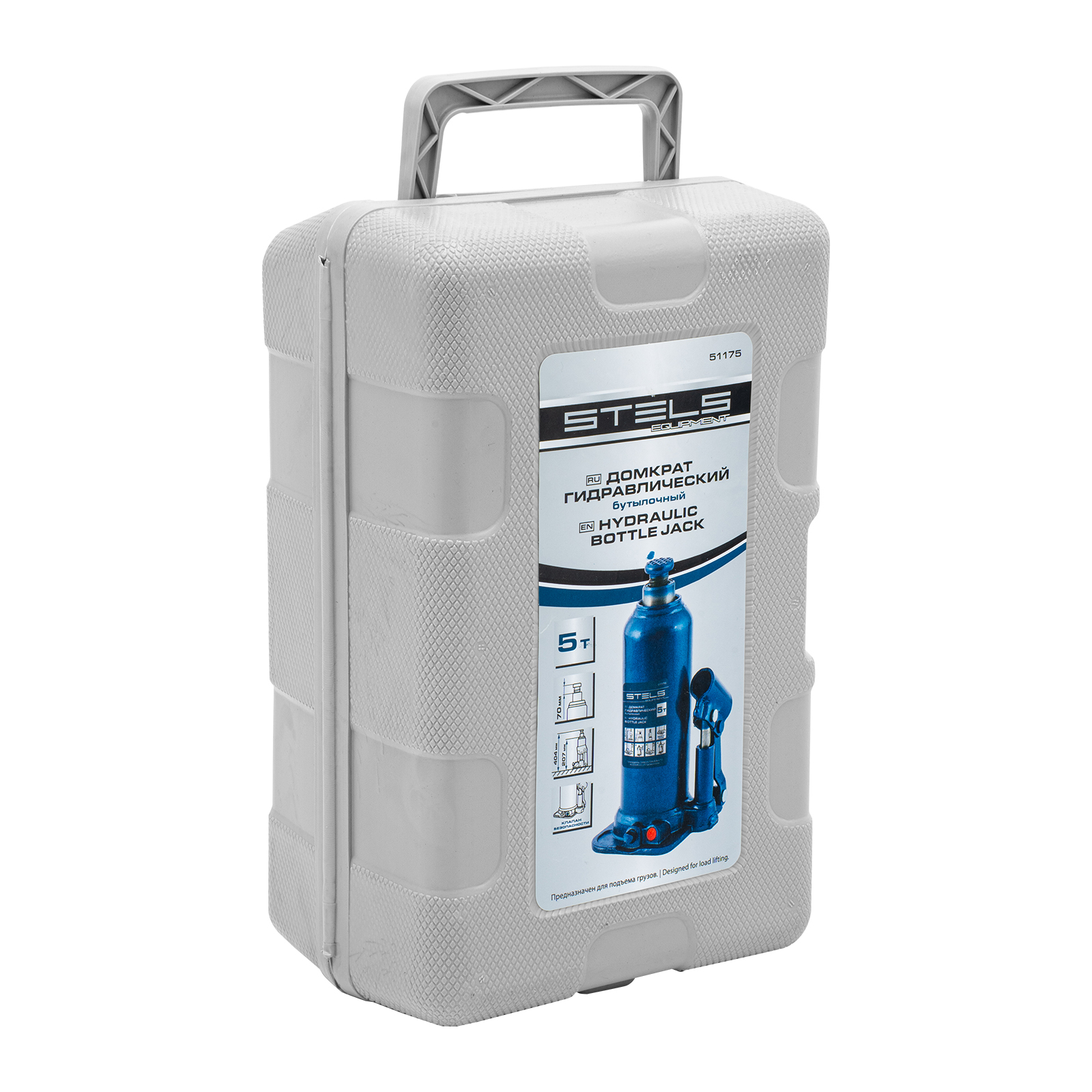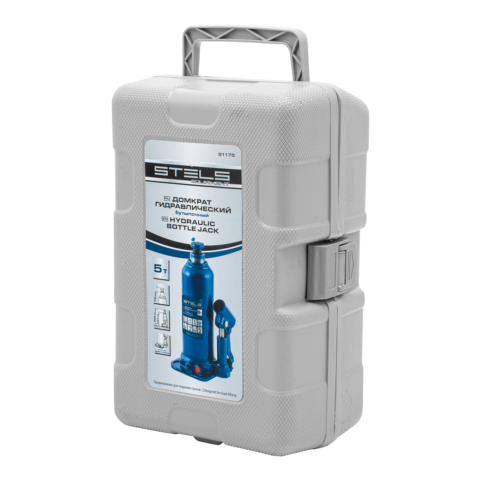 Гидравлический бутылочный домкрат Stels 51175 в пластиковом кейсе предназначен для поднятия грузов весом до 5 т на высоту 207-404 мм. Он не занимает много места и легко помещается в багажник, поэтому его можно брать с собой в дорогу или хранить в гараже. Используется для самостоятельного ремонта авто, также подходит для профессионального применения на станциях технического обслуживания.