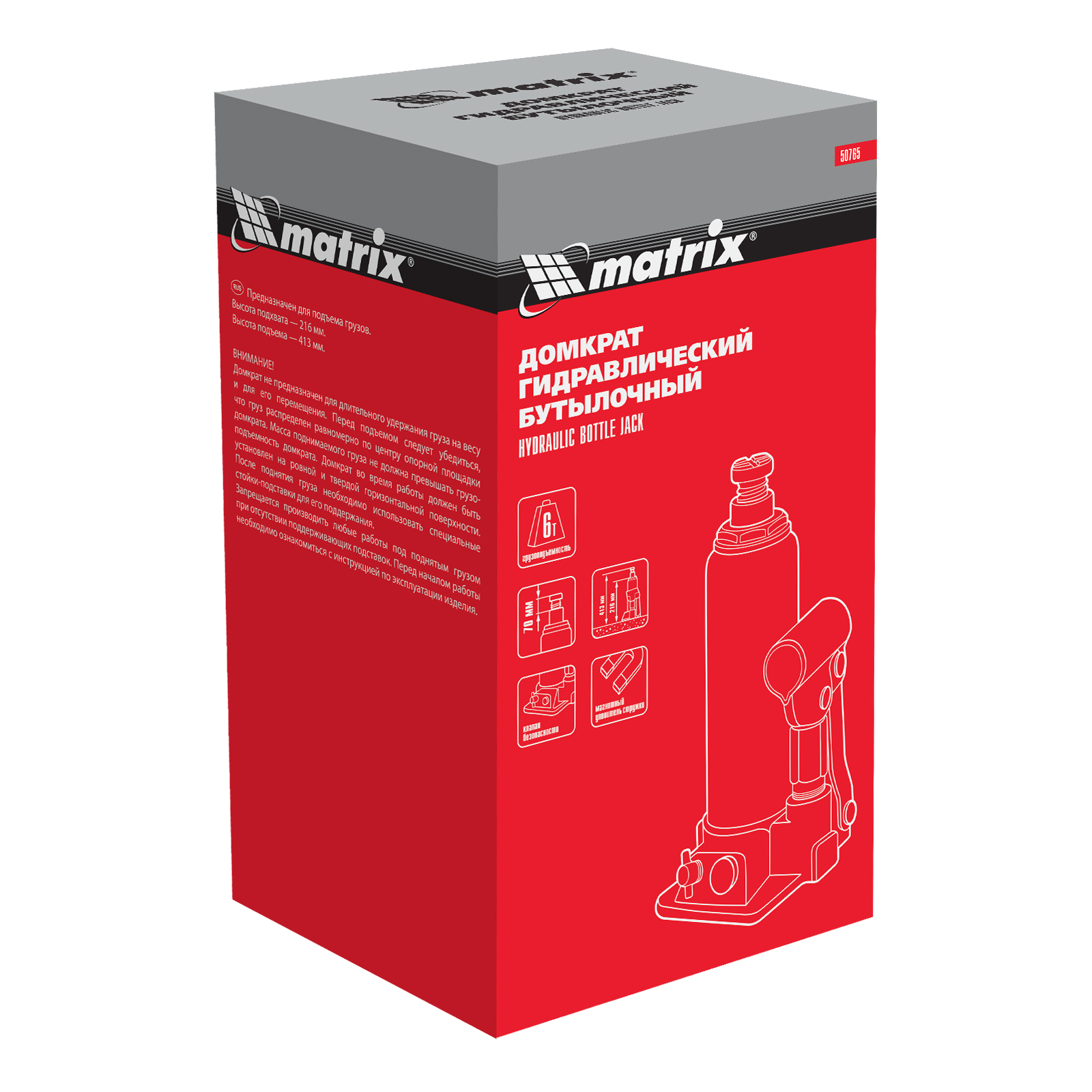 Гидравлический бутылочный домкрат Matrix 50765 предназначен для быстрого поднятия грузов массой до 6 т на высоту 216-413 мм. Будет полезен автолюбителям и мастерам СТО в качестве полупрофессионального инструмента. Встроенный магнитный уловитель металлической стружки защищает резиновые уплотнители от повреждений.