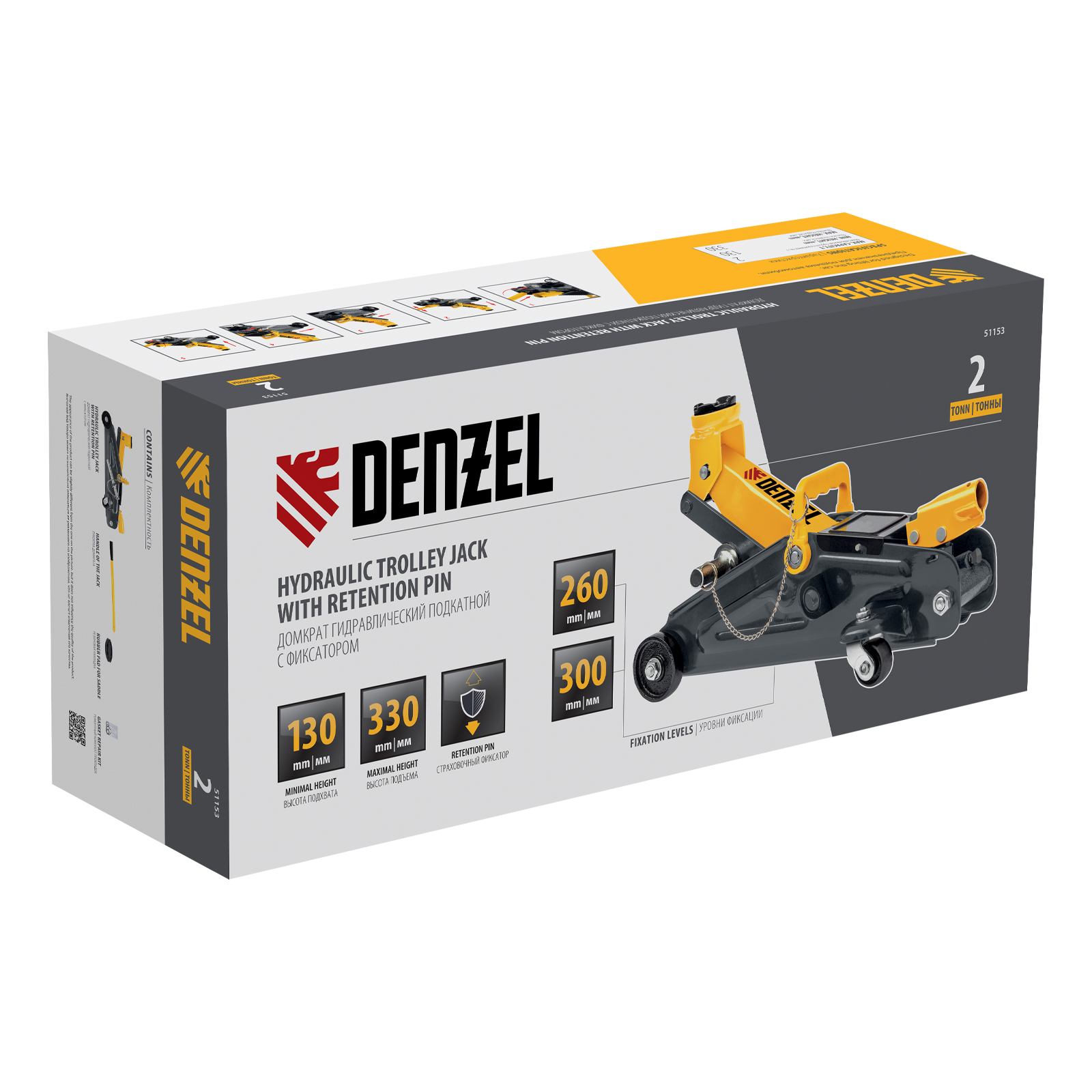 Гидравлический подкатной домкрат с фиксатором Denzel 51153, с высотой подхвата 130 мм, предназначен для плавного подъема грузов массой до 2 т на высоту до 330 мм. Страховочный штифт позволяет фиксировать подъемный рычаг на высоте 260 и 300 мм для безопасной работы. Домкрат пригодится владельцам легковых автомобилей со стандартным клиренсом.