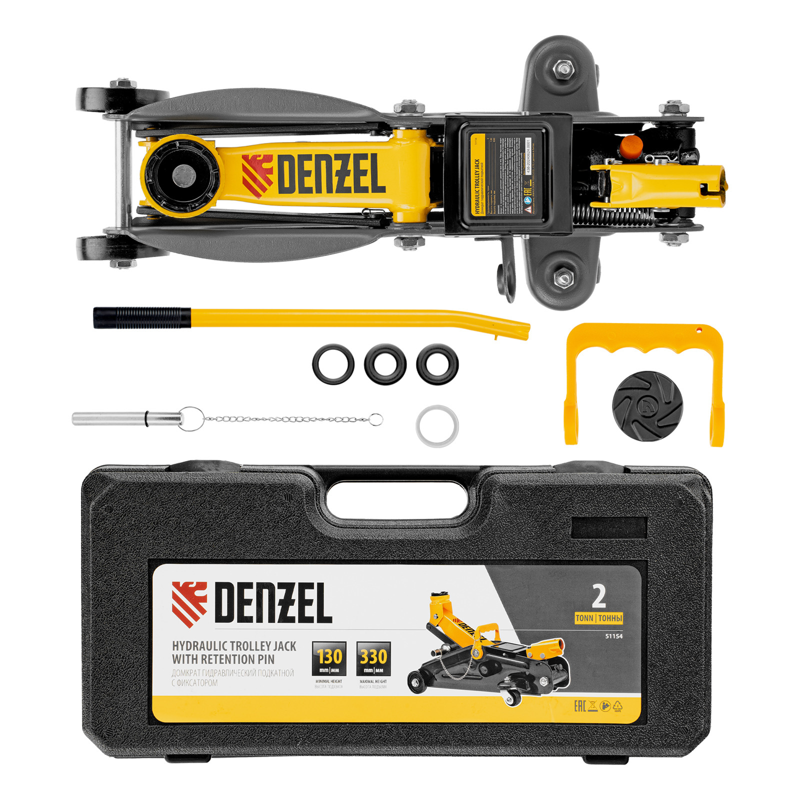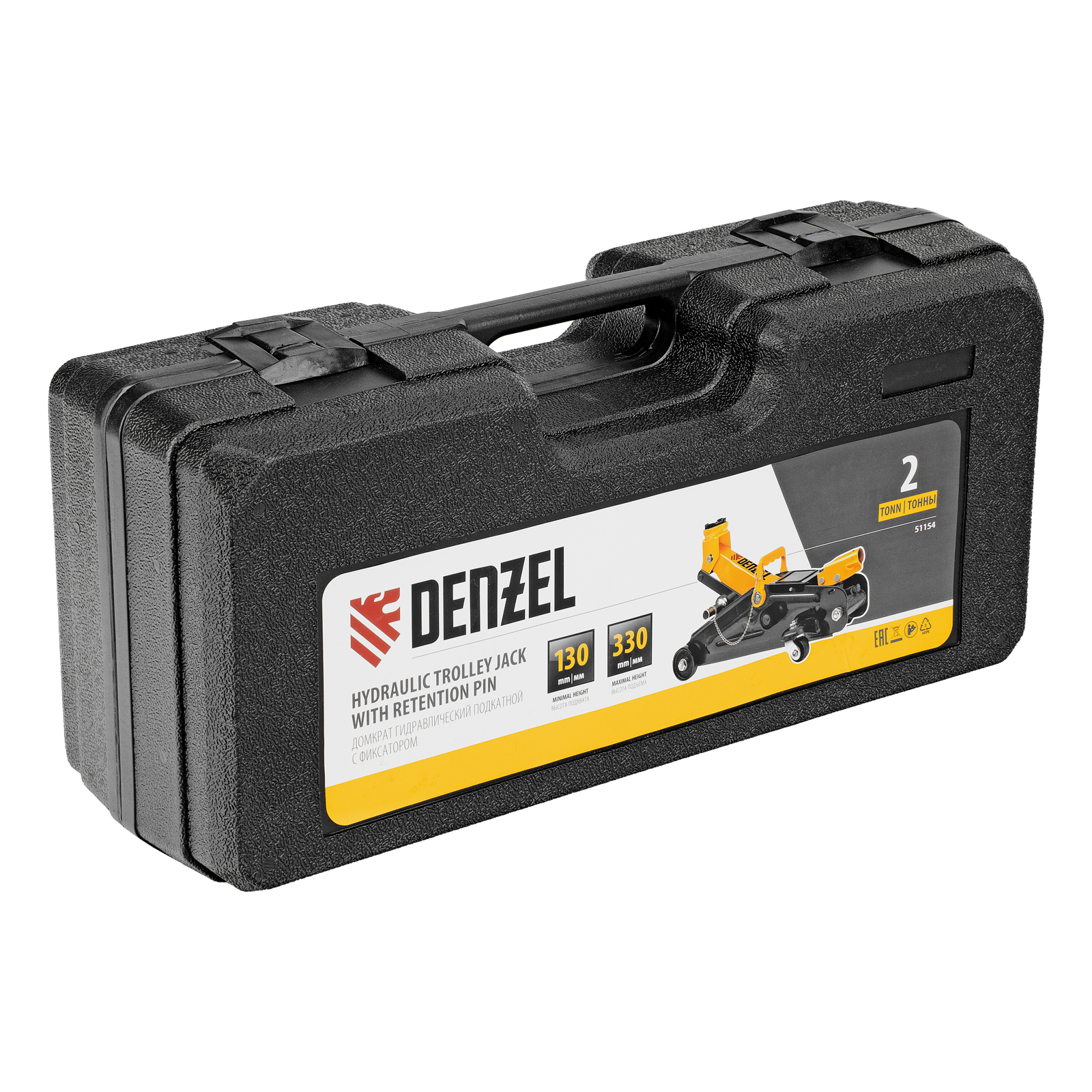 Домкрат гидравлический подкатной с фиксатором, 2 т, 130-330 мм, в кейсе Denzel в Москве