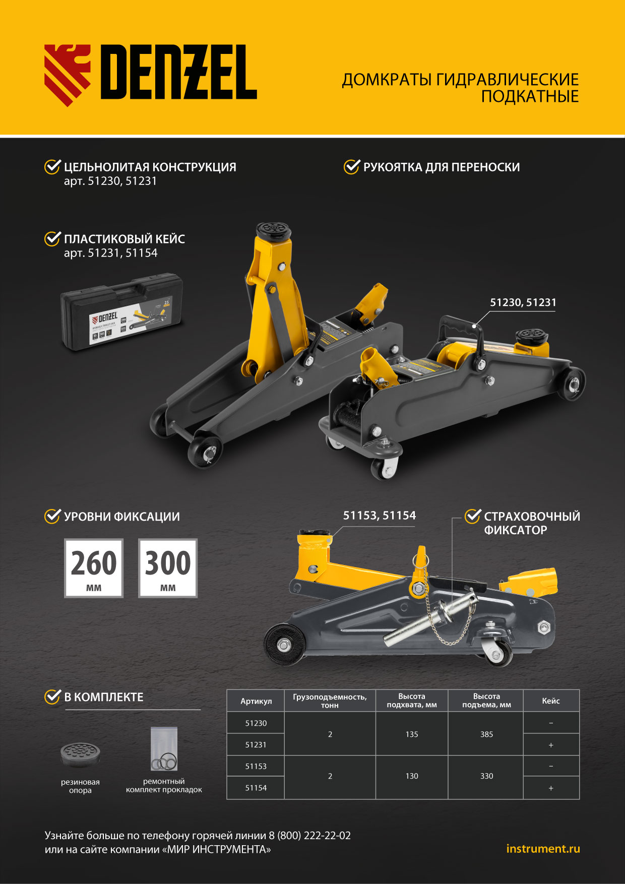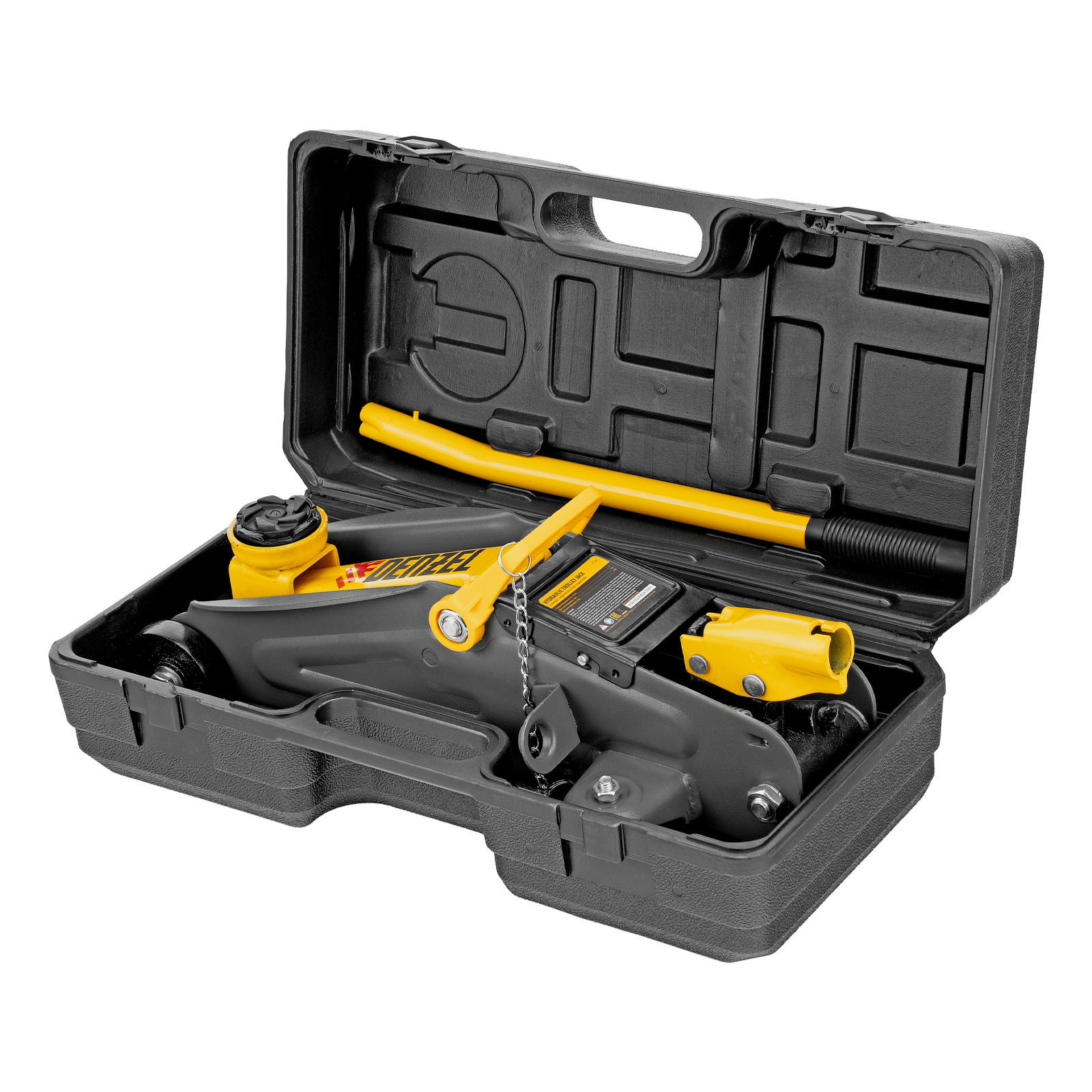 - Удобное хранение и транспортировка — домкрат поставляется в прочном пластиковом кейсе.