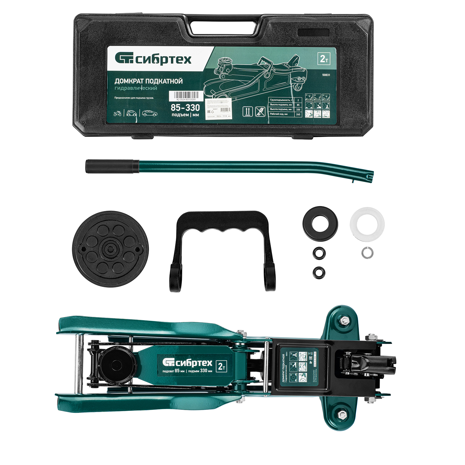 Гидравлический подкатной домкрат Сибртех 50831, поставляющийся в пластиковом кейсе, с высотой подхвата 85 мм, предназначен для подъема грузов массой до 2 т на высоту до 330 мм. Применяется для обслуживания автомобилей с низким клиренсом. Компактный домкрат подходит для самостоятельного использования автовладельцами.