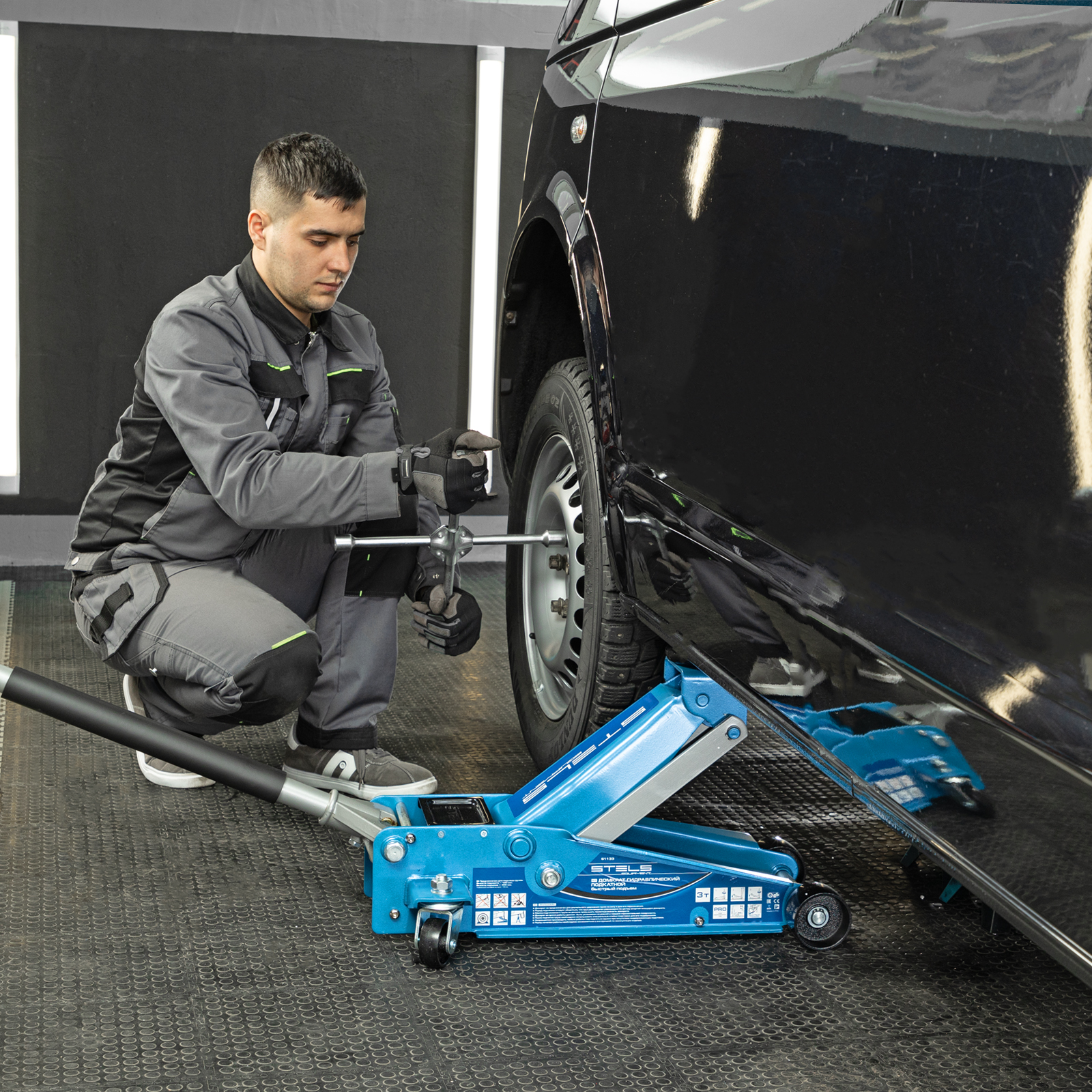 - Аккуратная работа — резиновая опора и прорезиненная ручка защищают кузов автомобиля и корпус домкрата от повреждений.