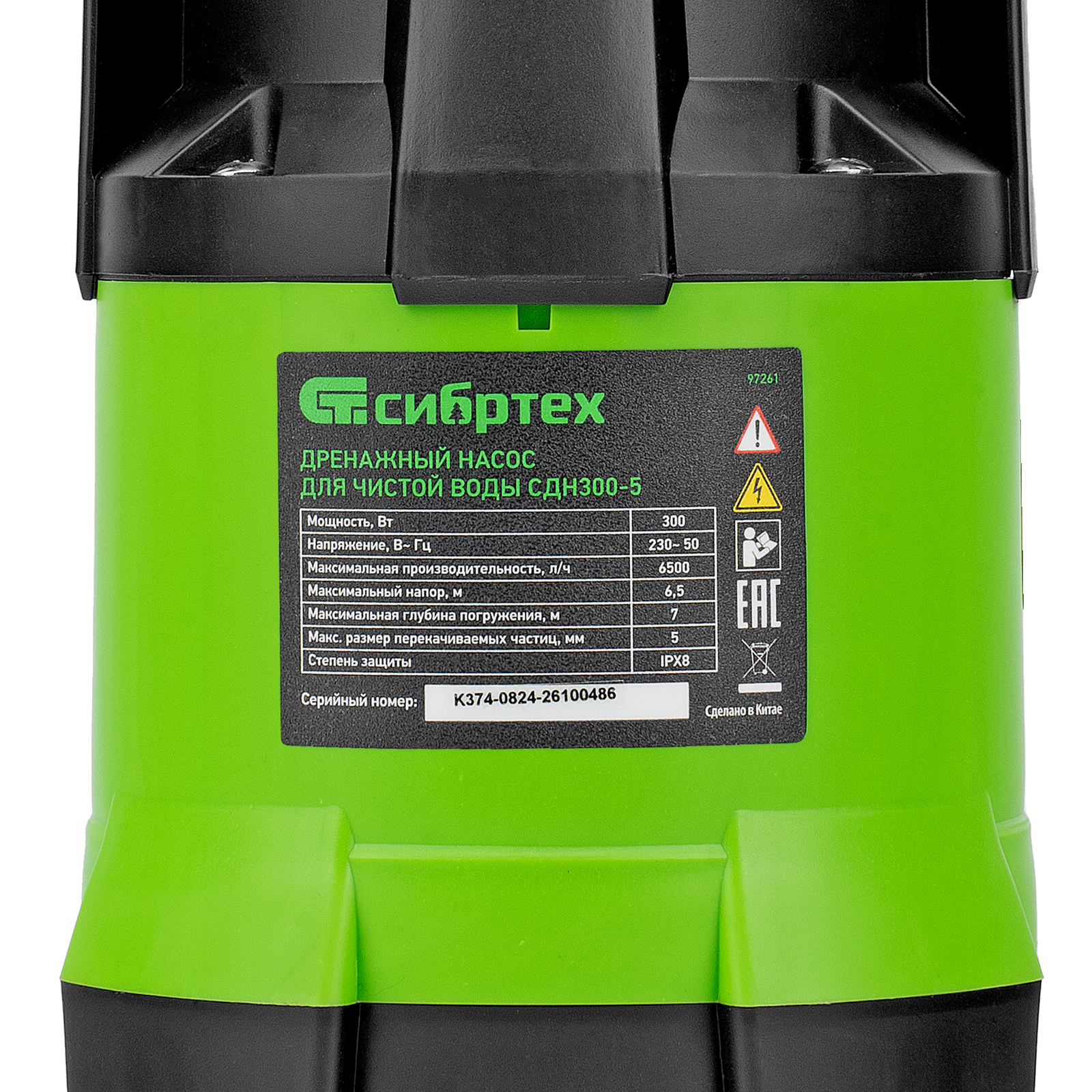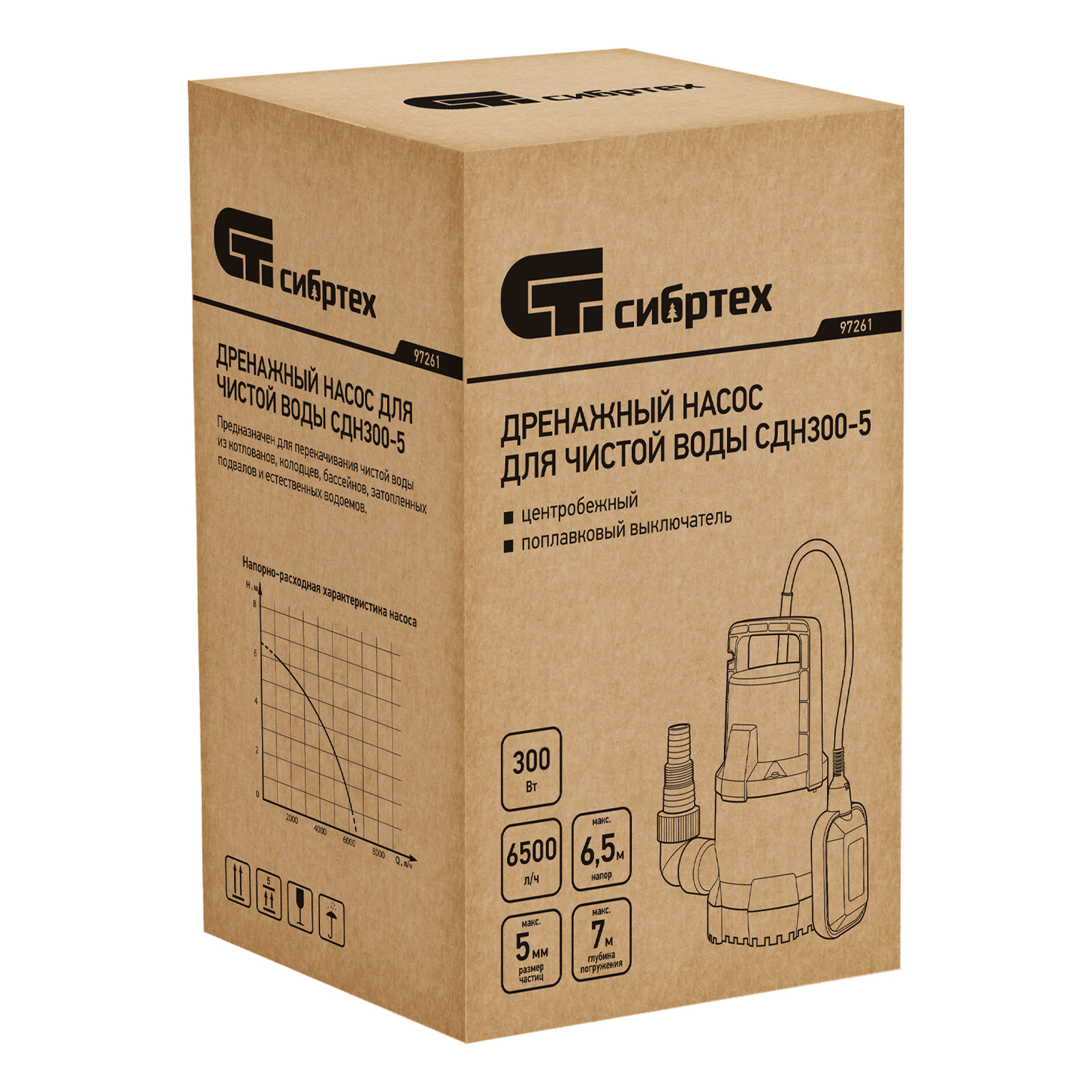 Дренажный насос для чистой воды СДН300-5, 300 Вт, напор 6.5м, 6500 л/ч Сибртех в Москве