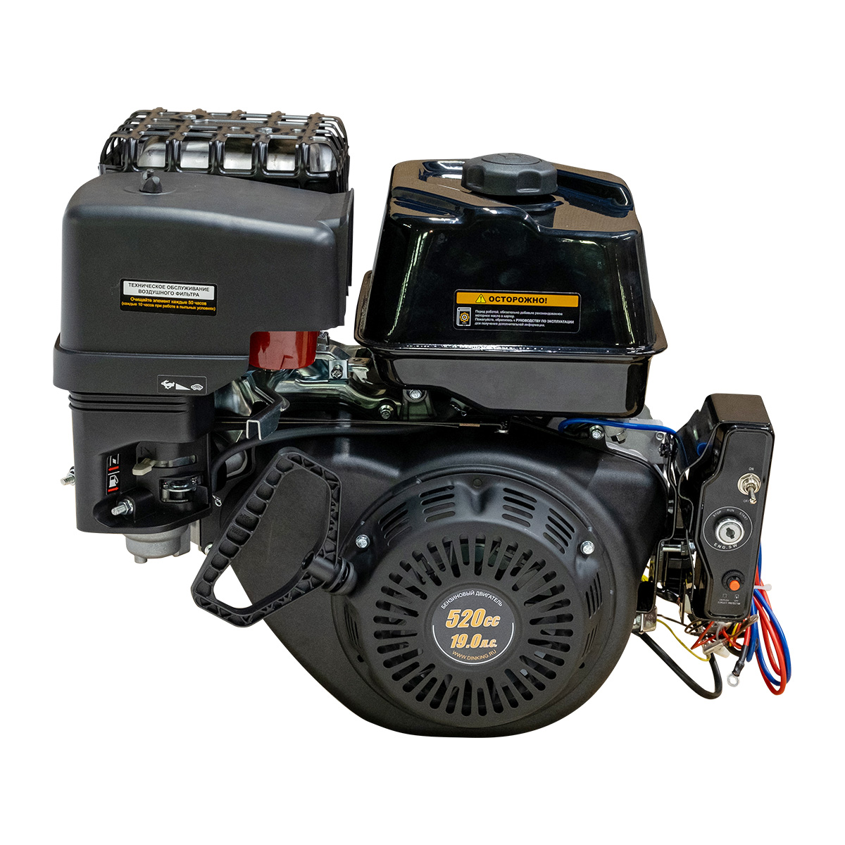 Катушка освещения позволяет подключать доп. оборудование суммарной мощностью 100 Вт. Технические характеристики включают рабочий объем в 520 кубических сантиметров, ручной и электрический стартер и другие параметры. Вес двигателя составляет 35,2 кг, объем бака для топлива – 6,5 литров.