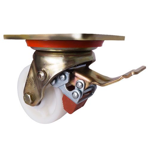 Данное большегрузное нейлоновое колесо предназначено для установки на передвижное оборудование, используемое в пищевой, химической и фармацевтической промышленности. Оно не боится воздействия влаги и различных химически агрессивных веществ, отличается низким коэффициентом трения и высокой износостойкостью. Шариковый подшипник в оси обеспечивает плавное вращение. Поворотный кронштейн изготовлен из оцинкованной стали, тип крепления — платформа с отверстиями под болты. Наличие тормозного механизма позволяет при необходимости надежно блокировать колесо, предотвращая его самопроизвольное перемещение. Максимальная грузоподъемность модели — 550 кг.