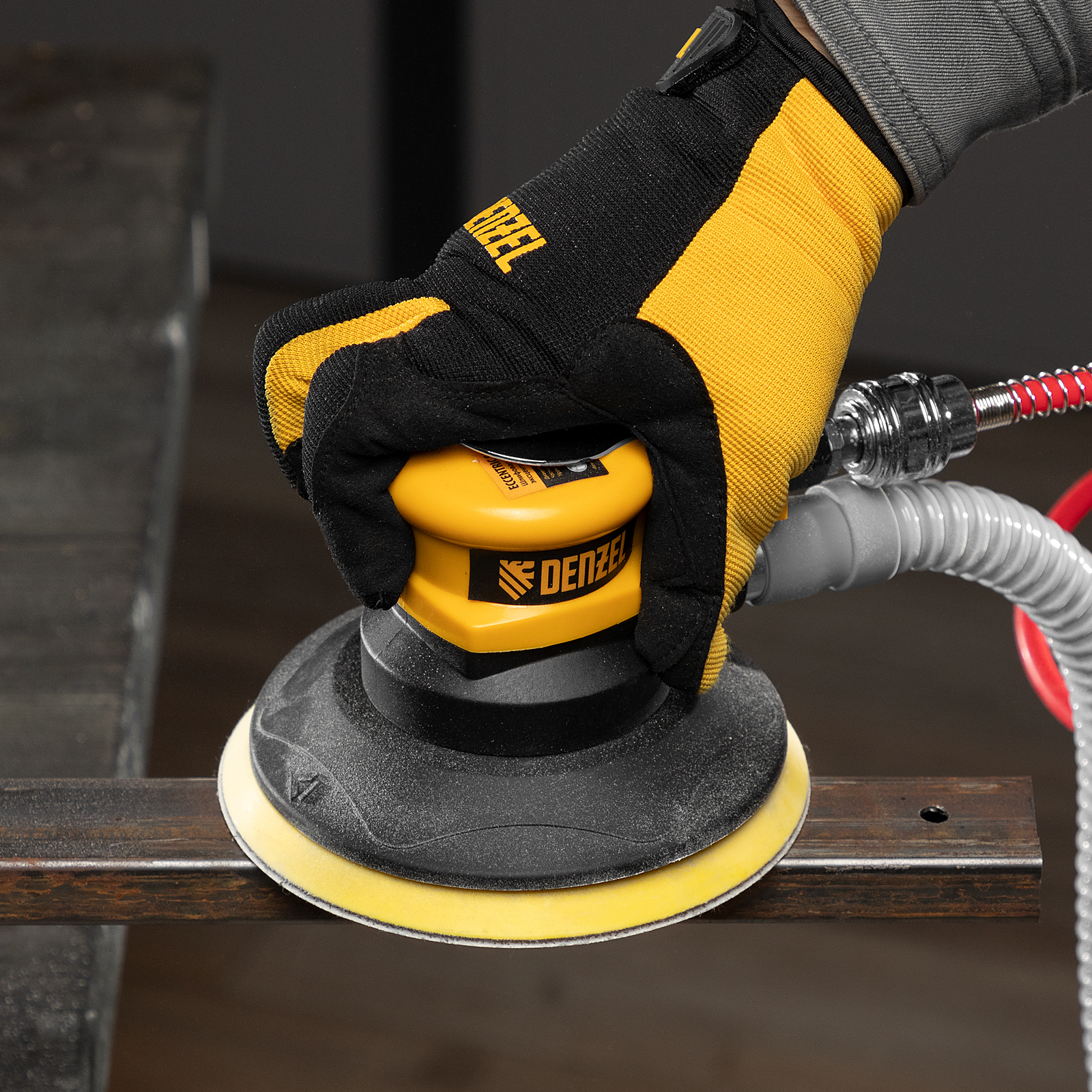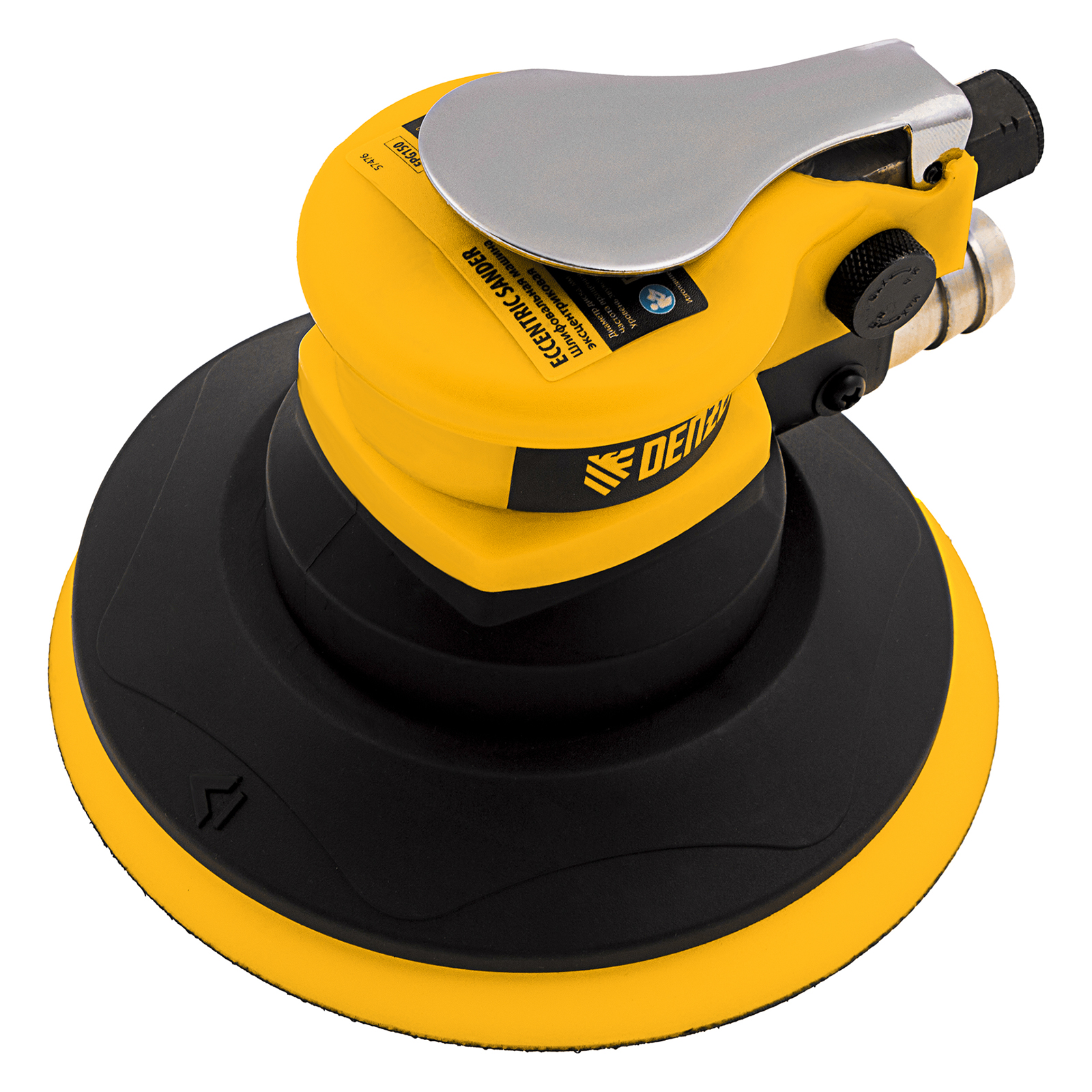 Пневматическая эксцентриковая шлифовальная машина Denzel EPG150 57476 с амплитудой 5 мм развивает скорость вращения 10000 об/мин при среднем расходе воздуха 160 л/мин. Этого достаточно для эффективного шлифования, зачистки и выравнивания любых поверхностей (древесины, металла, пластика и т.д.). С помощью машинки можно без усилий подготовить материал любой твердости к покраске или отделке, выровнять металл перед сваркой. А при использовании более мягкой насадки получится сделать любую поверхность абсолютно гладкой и придать ей дополнительный блеск.,Орбитальная шлифмашина предназначена для работы при давлении 6,3 бар, расход воздуха не превышает 200 л/мин. Во время работы не забывайте использовать специальное масло ISO 46, которое можно добавлять как напрямую в инструмент, так и с помощью блока подготовки воздуха Denzel 57469, включающего в себя лубрикатор для автоматической подачи масла.