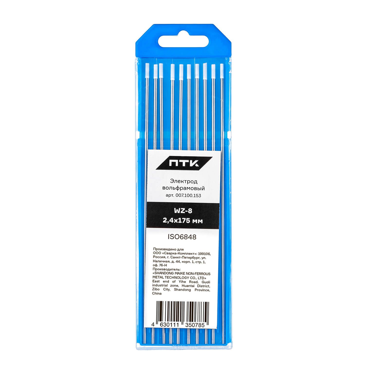 Электрод легирован оксидом циркония (ZrO₂), содержание которого не превышает 0,9%. Диаметр электрода 2,4 мм, длина электрода 175 мм. Вольфрам имеет белый цветовой код. Поставляется в пластиковом пенале по 10 штук. В карточке с товаром указана цена за 1 вольфрамовый электрод.
