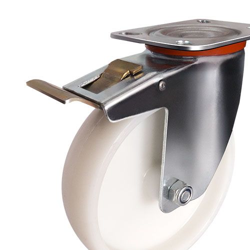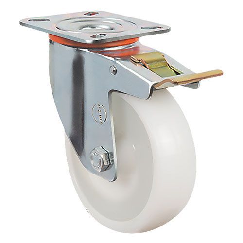 Колесная опора EMES EM01 ZKZ 150 F устанавливается на платформенные тележки для пищевой промышленности, передвижное медицинское оборудование и технику. Нейлоновый обод хорошо распределяет нагрузку. Поворотный кронштейн с тормозом изготовлен из оцинкованной стали. Максимальная грузоподъемность модели составляет 180 кг. Рабочий температурный диапазон — от -20 до +70 °С.