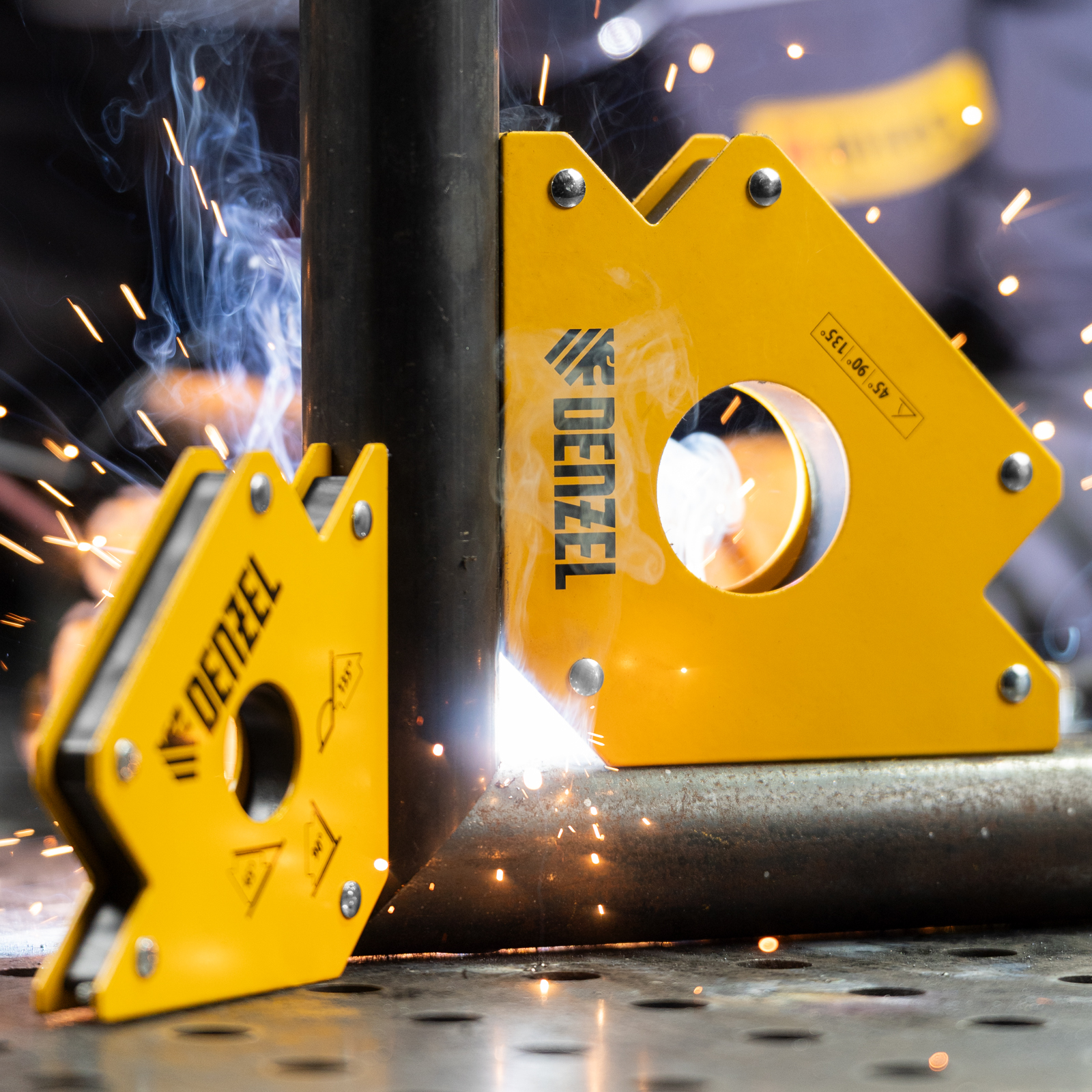 Фиксатор магнитный Denzel 97560 выдерживает усилие 75 LB (34 кг) и используется при проведении сварочных работ. Надежно фиксирует детали разного размера под углом 45°, 90° и 135° без риска их смещения или падения.