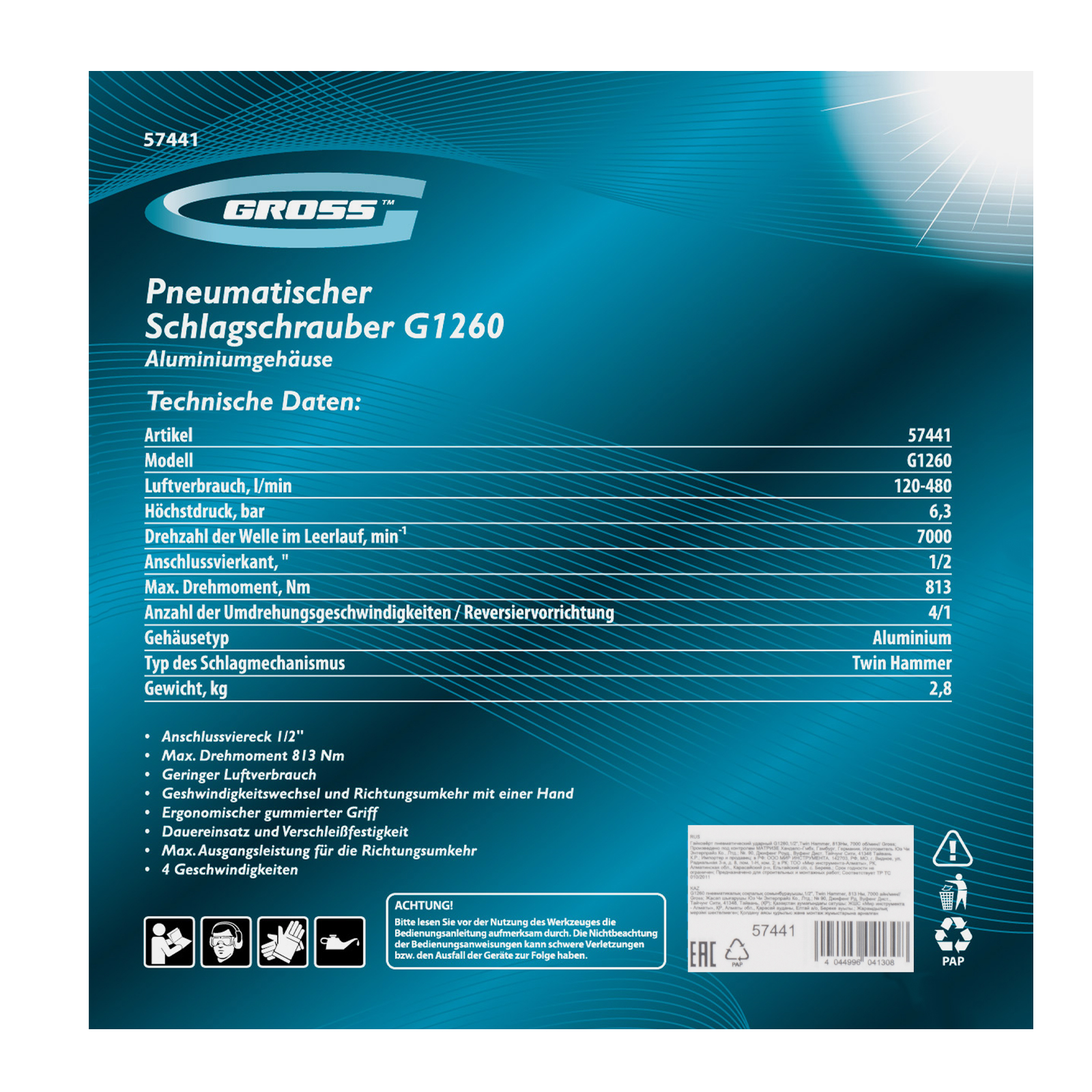Гайковерт пневматический ударный G1260,1/2, Twin Hammer, 813Нм, 7000 об/мин Gross в Москве