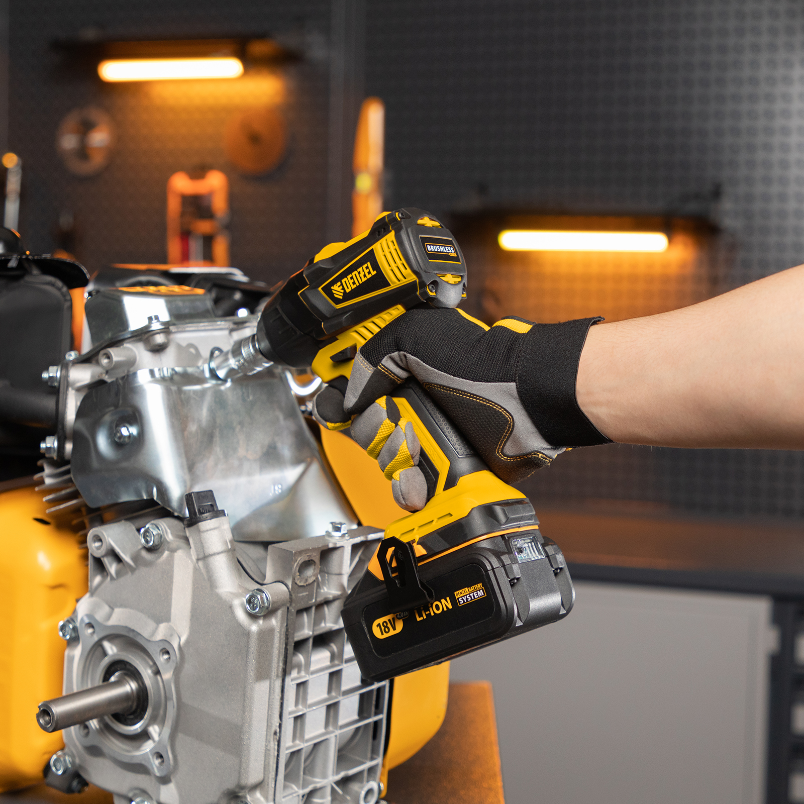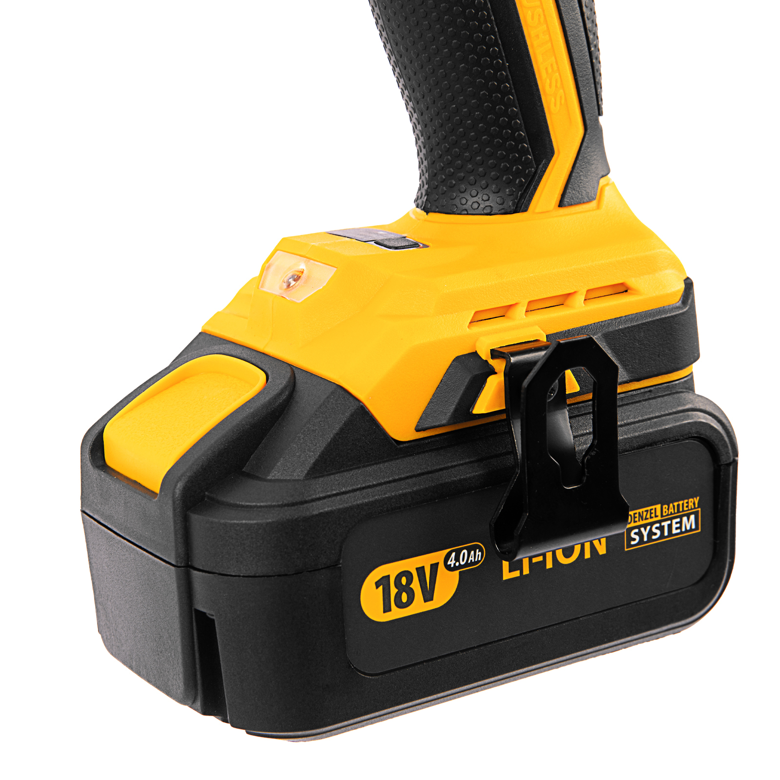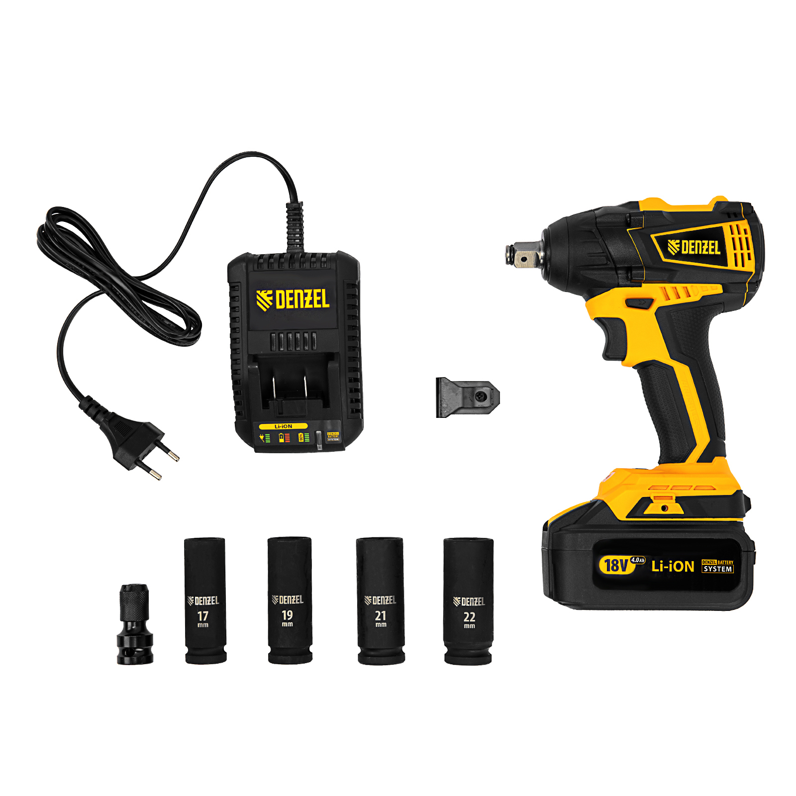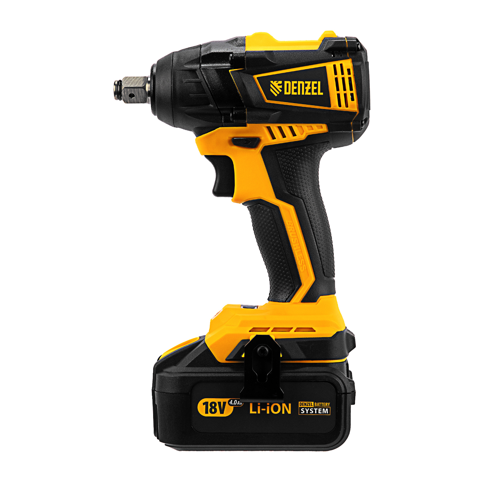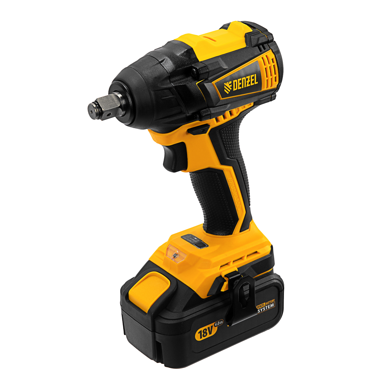 - Универсальность — аккумулятор 4 А/ч Li-ion совместим с любым инструментом 18V Denzel battery system серии IB.