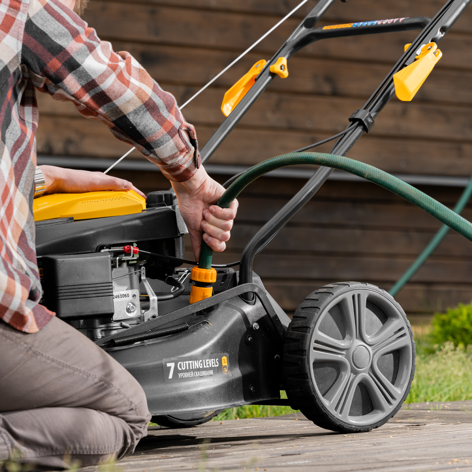 - Легкая очистка — благодаря системе Quick Clean и специальному штуцеру дека легко очищается, а остатки травы и грязи смываются с внешних частей под напором чистой воды.