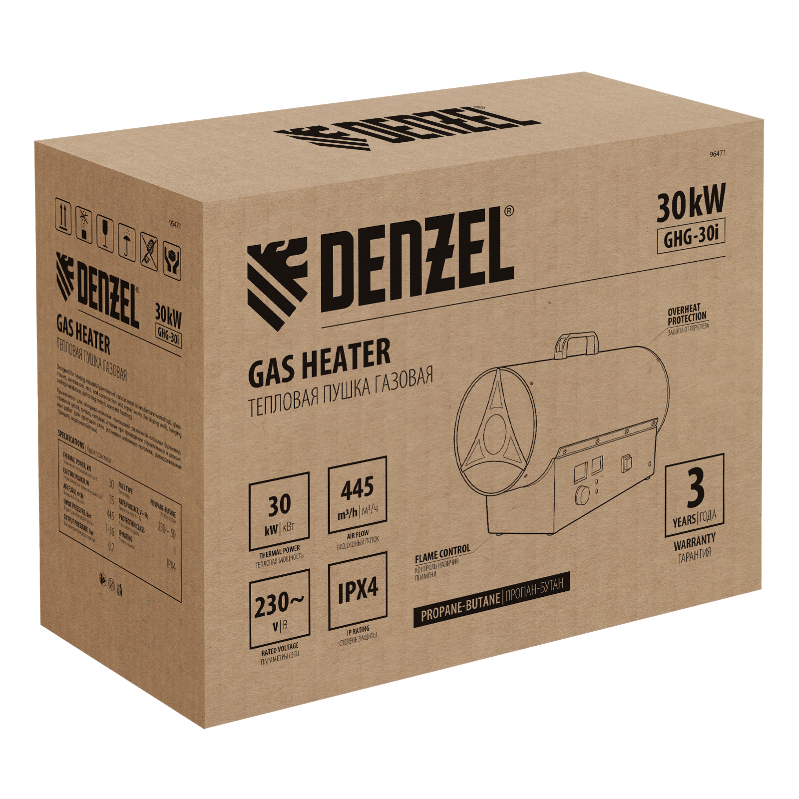 Газовая тепловая пушка Denzel GHG-30i 96471 мощностью 30 кВт, с цифровым термостатом и двойным электромагнитным клапаном, работает на сжиженном газе пропан-бутан и предназначена для обогрева хорошо вентилируемых нежилых помещений площадью до 300 м²: складов, цехов, гаражей, мастерских, теплиц. Генерирует воздушный поток 445 м³/ч, поэтому эффективно справляется с поставленными задачами. Используется на строительных и производственных объектах, для монтажа натяжных потолков.