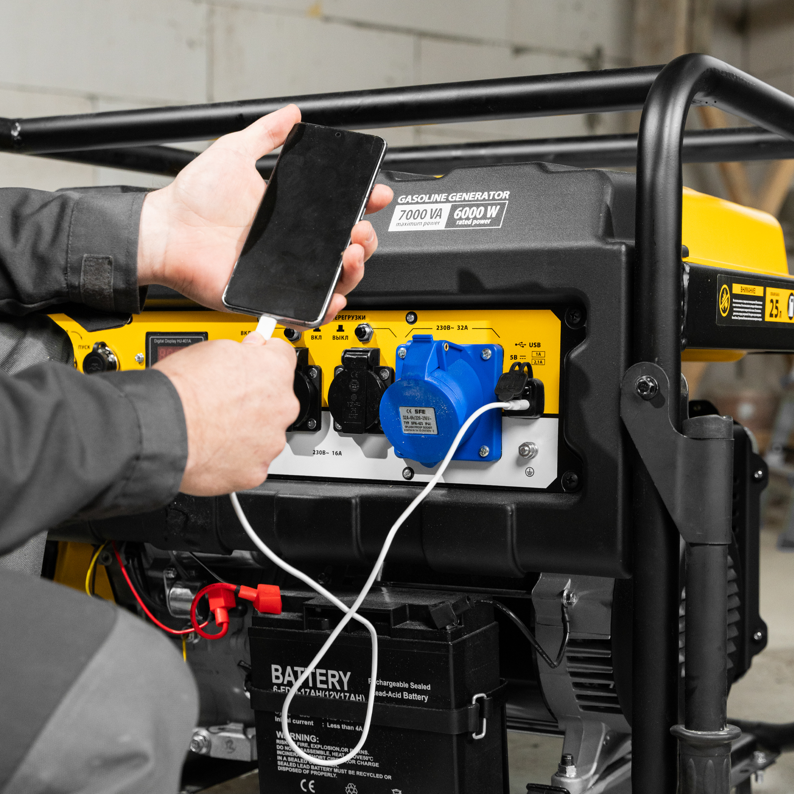 - Силовая розетка 230В/32А позволяет снять полную мощность с генератора.