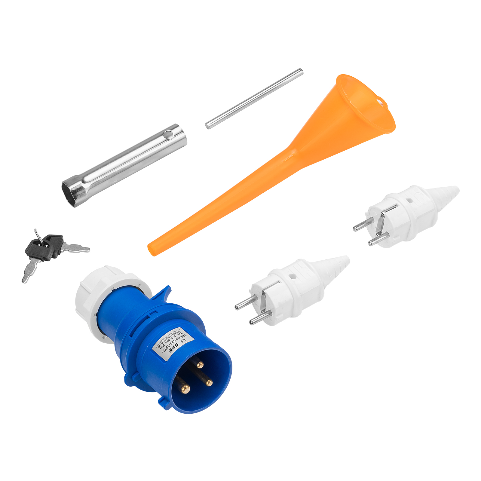 Генератор - 1 штКлюч свечной - 1 штКлюч зажигания - 2 штВилка 230В/16А - 2 штВилка 230В/32А - 1 штРуководство по эксплуатации с гарантийным талоном - 1 штБатарея аккумуляторная - 1 шт |