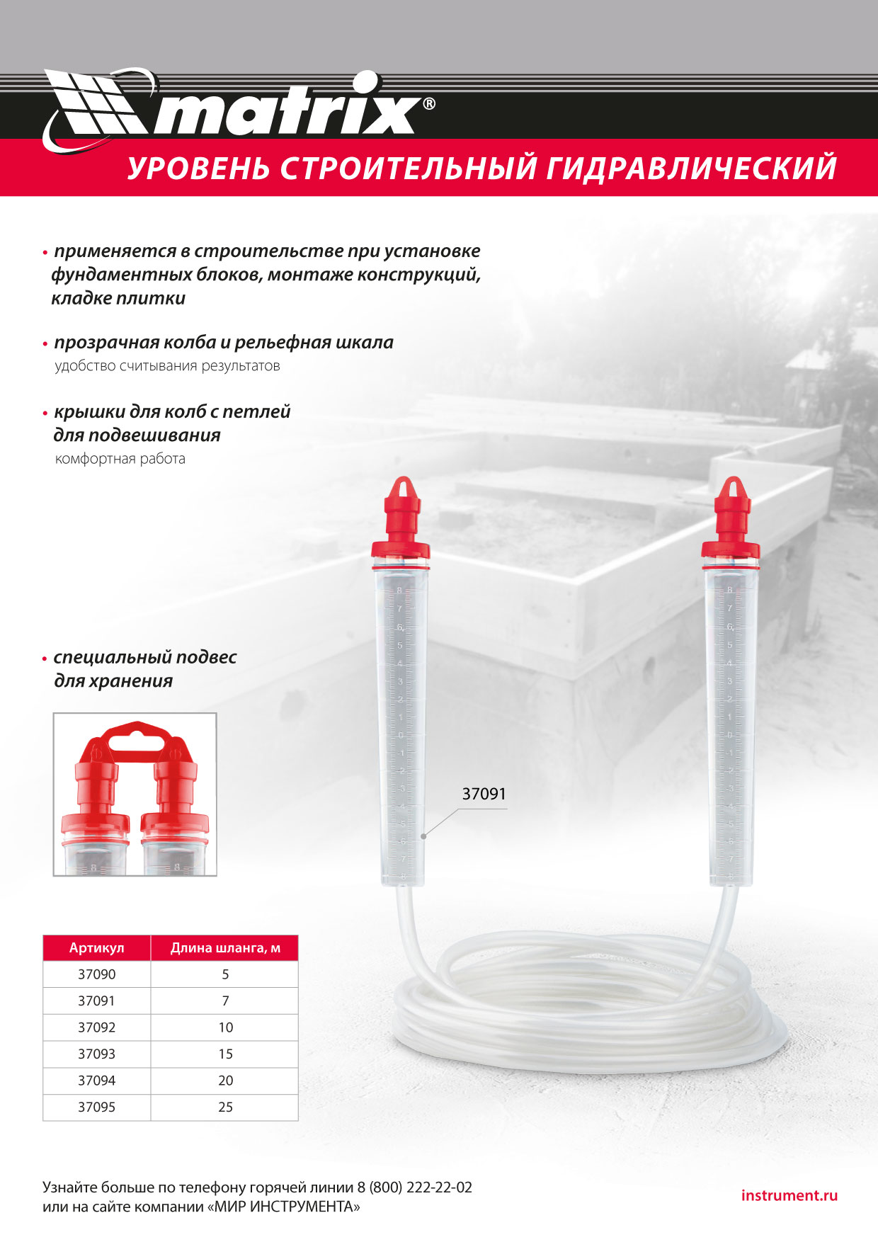 Гидроуровень Matrix 37091 с удлиненными колбами и рельефной градуировкой предназначен для выравнивания объектов на расстоянии до 7 м. Используется при проведении ремонтно-строительных работ: изготовлении опалубки, установке фундамента, кладке плитки. Особо светлые колбы с рельефной градуировкой облегчают считывание результатов измерения.