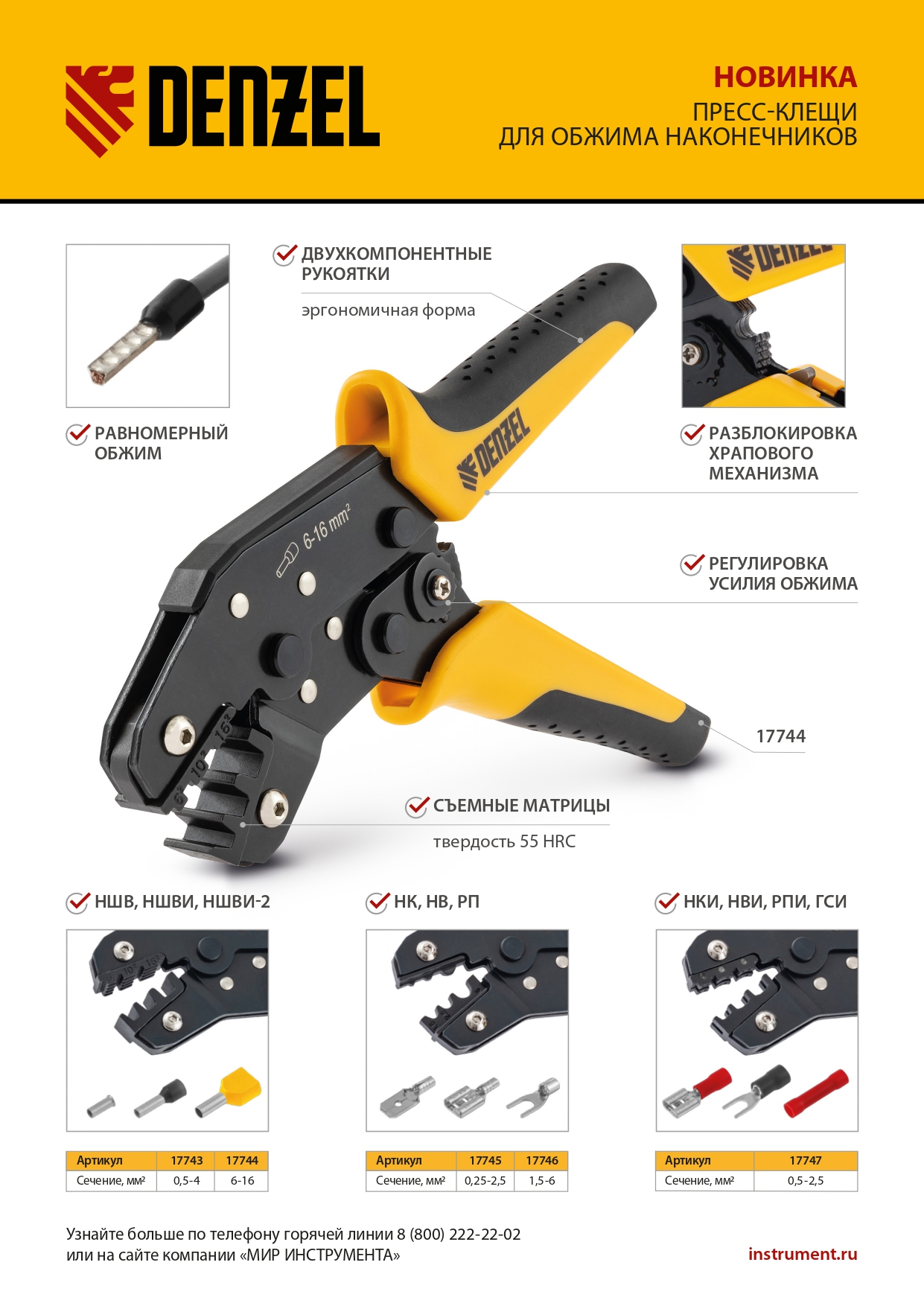 - Долговечность — инструмент выполнен из конструкционной углеродистой стали, матрица для обжима (губки) закалена до твердости 450-600 HV.