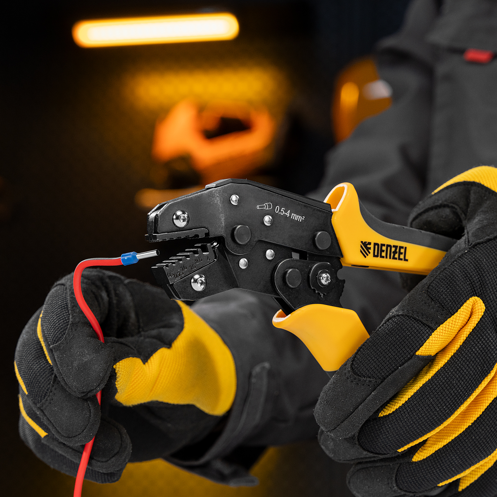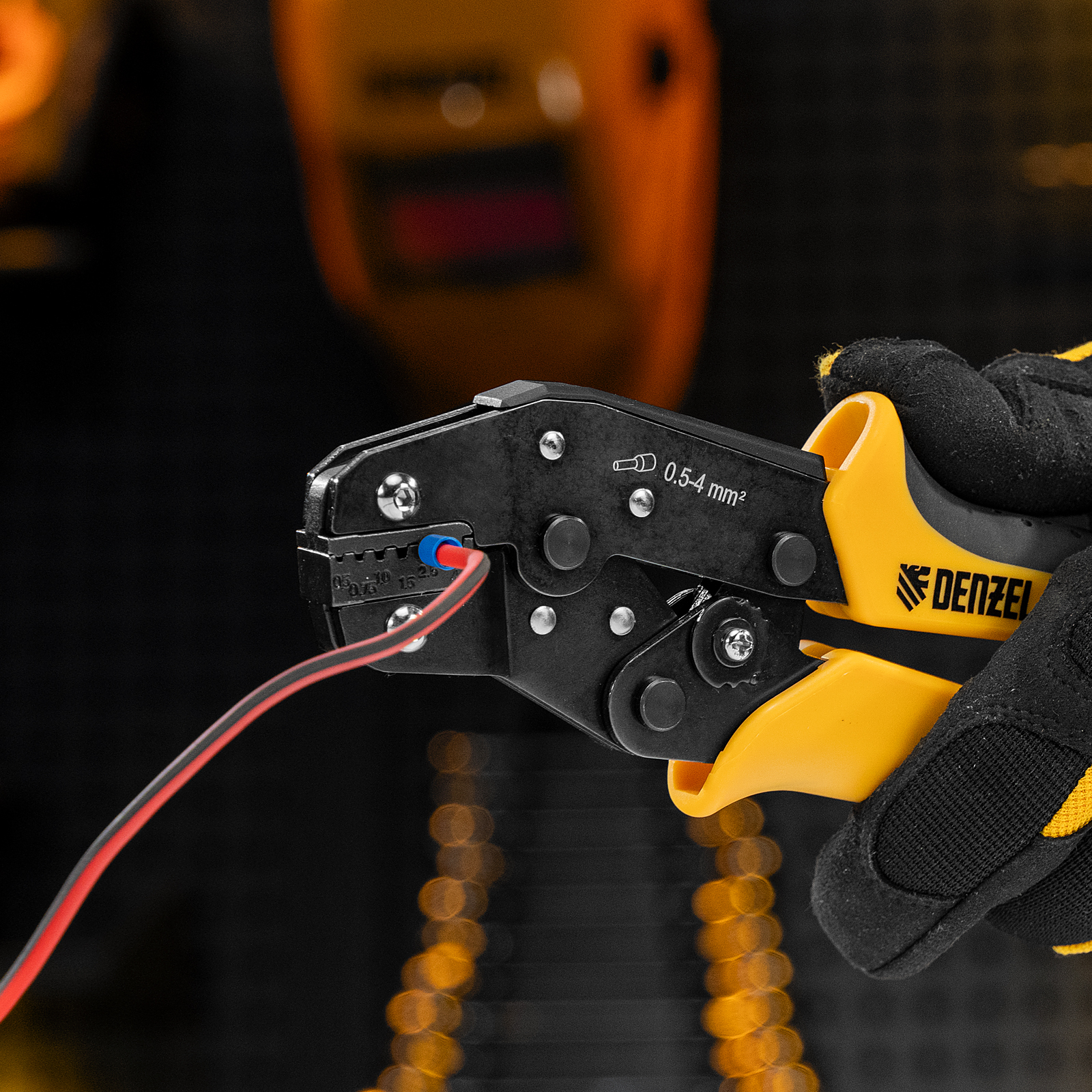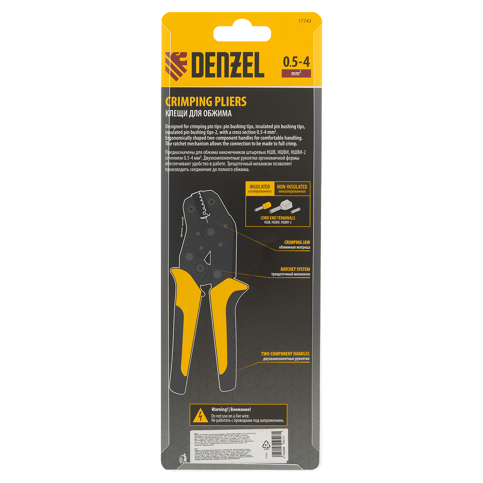 Клещи Denzel 17743 предназначены для обжима наконечников штыревых втулочных НШВ, НШВИ, НШВИ-2 сечением 0,5-4 мм². Двухрычажная передача силы сжатия позволяет увеличить эффективность работы без дополнительных усилий мастера. Инструмент пригодится частным и профессиональным мастерам при проведении электромонтажных работ.