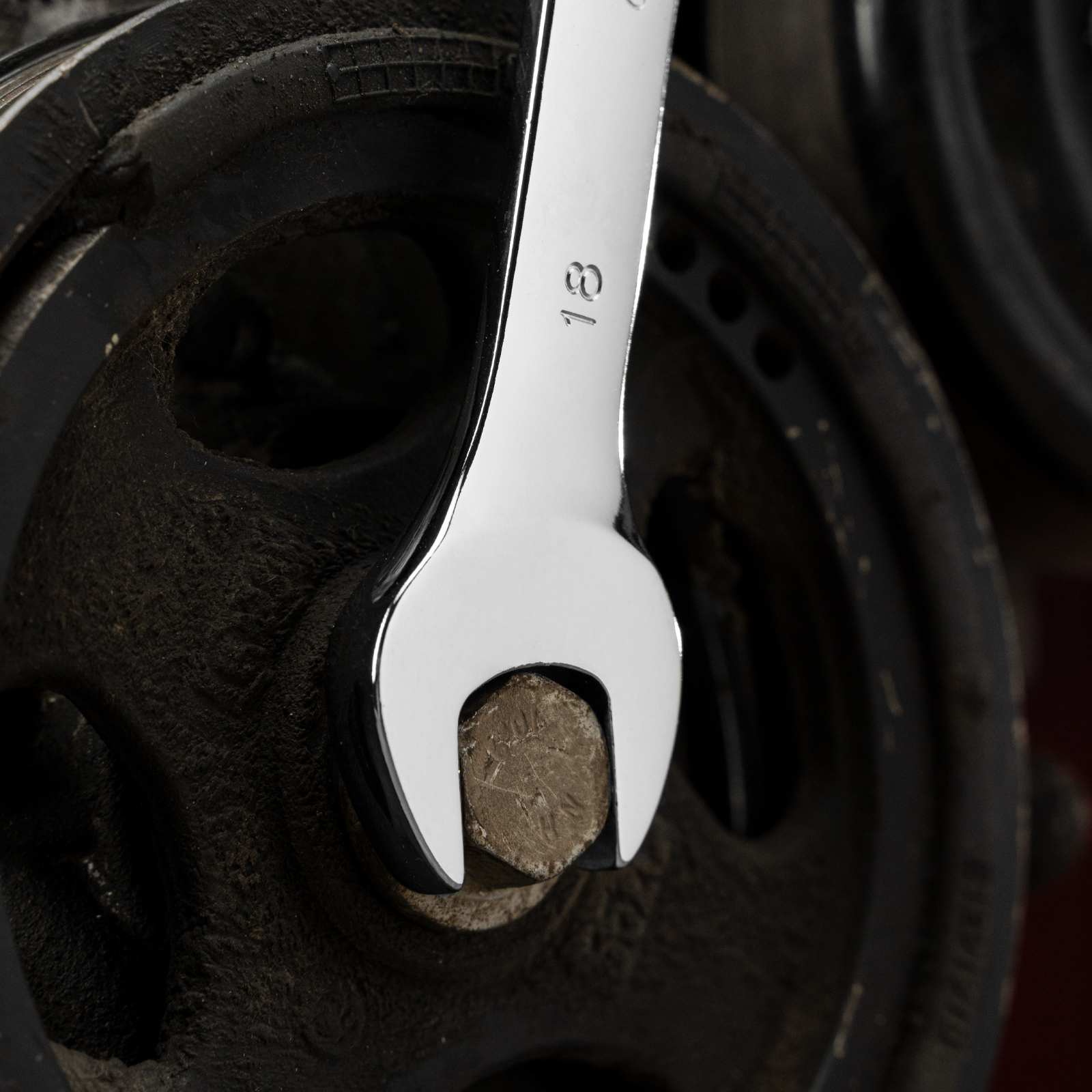Комбинированный трещоточный ключ Matrix 14811 из стали CrV, с покрытием «зеркальный хром», размером 18 мм, позволяет быстро откручивать и закручивать болты и гайки. Рожковую часть удобно использовать там, где нет возможности полного охвата детали, а трещоточный механизм повышает удобство работы в труднодоступных местах.