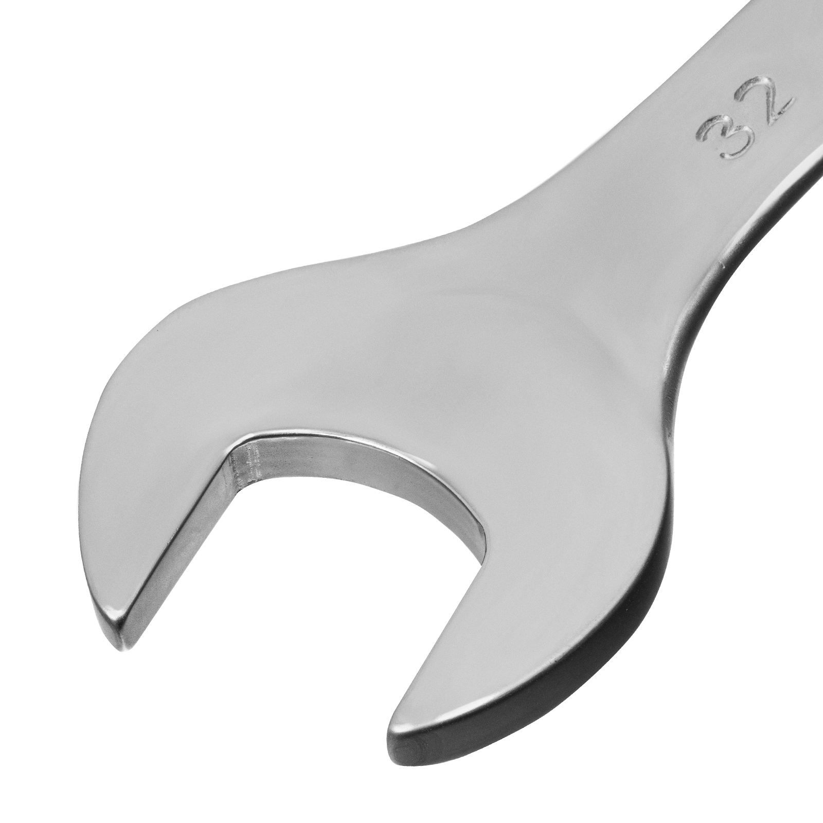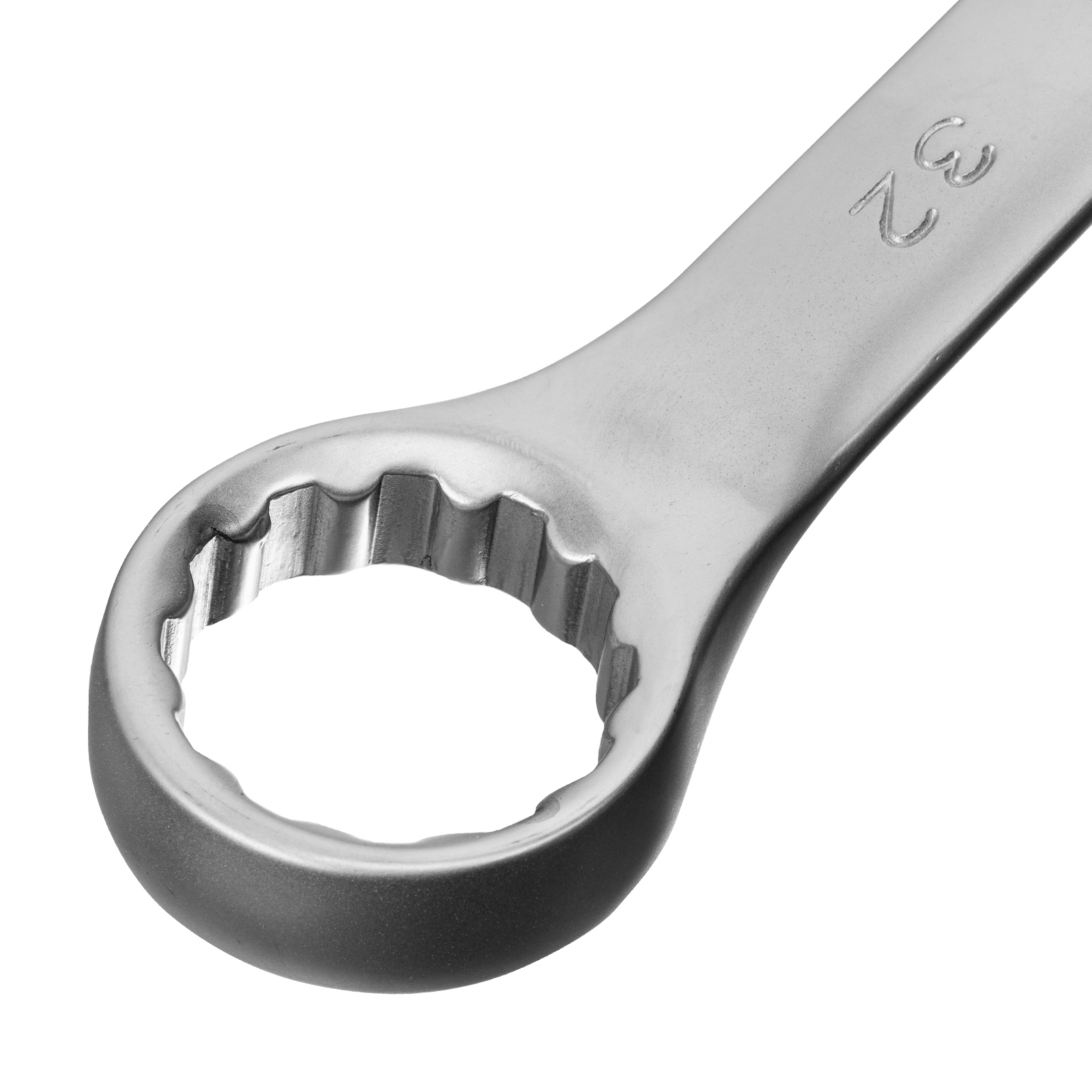 Комбинированный ключ Matrix 15121 размером 32 мм, из стали CrV, с покрытием «матовый хром», пригодится во время ремонтных работ дома или в гараже. С его помощью можно быстро монтировать и демонтировать крепежные элементы. Угол наклона кольцевого зева относительно плоскости инструмента составляет 15°, поэтому ключом удобно работать в труднодоступных местах.