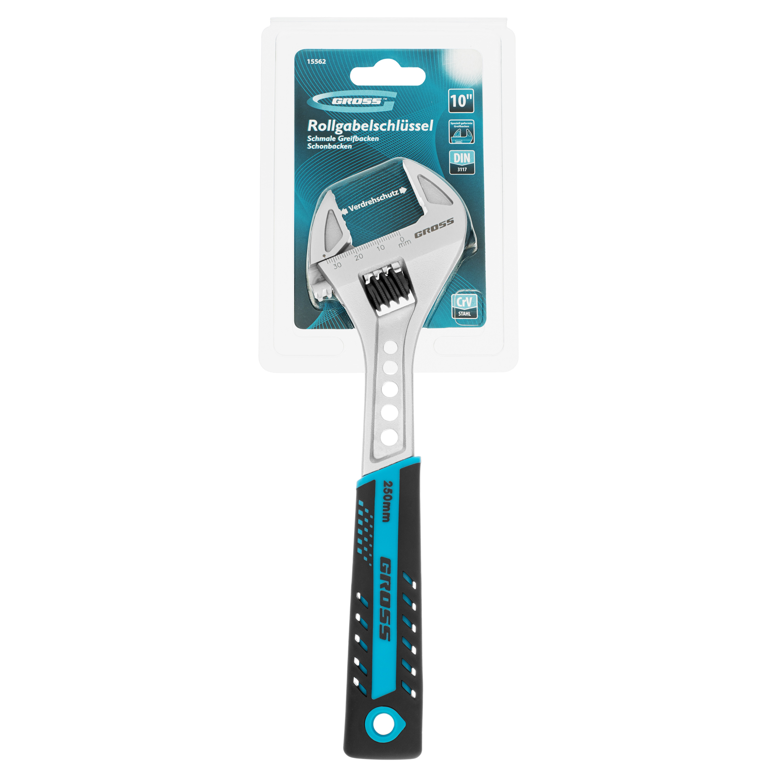 Разводной ключ Gross 15562 длиной 250 мм, из стали CrV, с двухкомпонентной ручкой, служит для монтажа и демонтажа крепежных элементов. Губки со специальными насечками надежно захватывают детали и не скользят по их поверхности. Максимальная ширина раскрытия губок составляет 35 мм, что позволяет работать с предметами разного размера и формы.