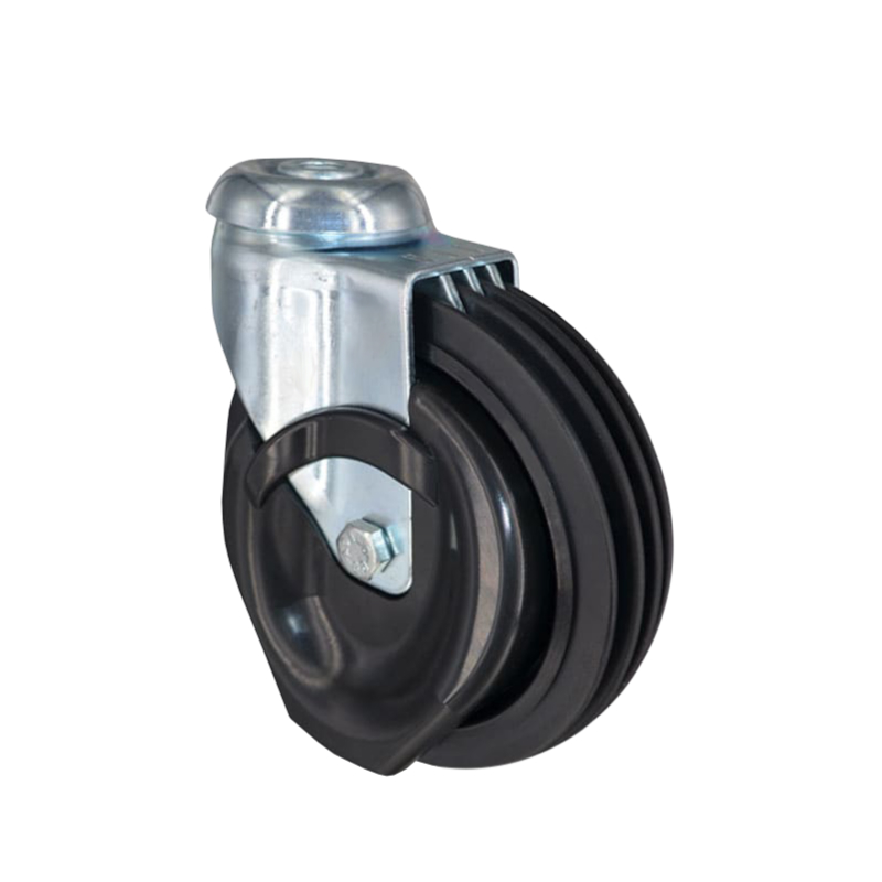 Данная поворотная колесная опора предназначена для оборудования, которое используют в супермаркетах с траволаторами — движущимися дорожками без ступеней. Оснащена встроенным тормозом, имеет реборды для предотвращения соскальзывания и обеспечения устойчивости при движении по траволаторам. Обод модели выполнен из полипропилена, кронштейн — из оцинкованной стали, шинка — из полиуретана, отличающегося высокой износостойкостью. Тип фиксации кронштейна — с помощью болта. Грузоподъемность EY04PBP125F составляет 80 кг, диаметр — 125 мм.