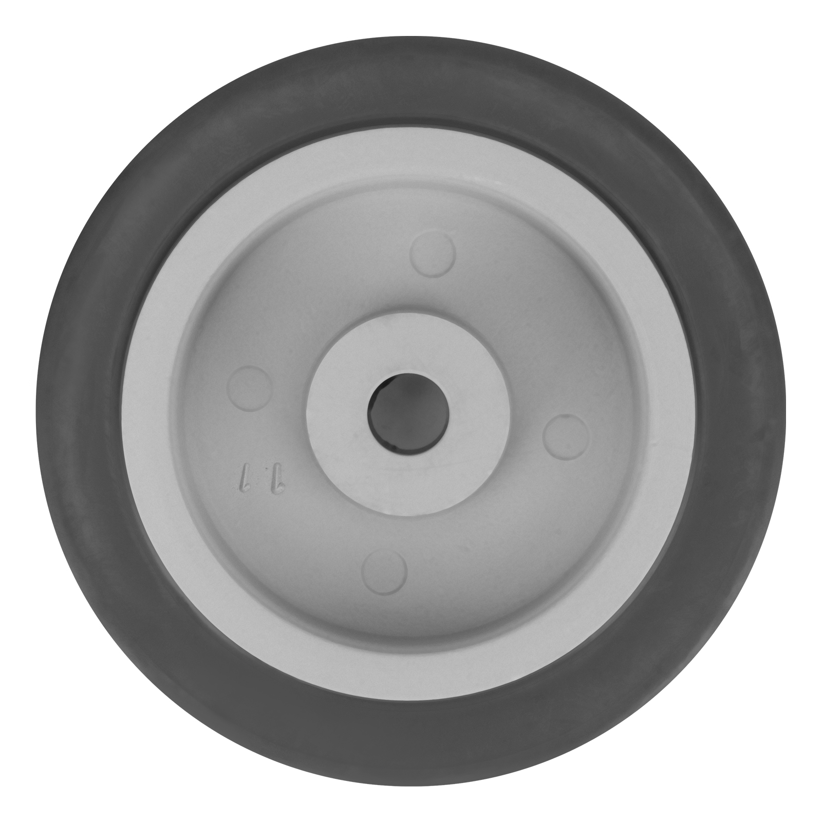 - Универсальность — контактная поверхность выполнена из термопластичной серой резины, поэтому колесо может применяться на различных покрытиях, долгое время сохраняя рабочие качества.