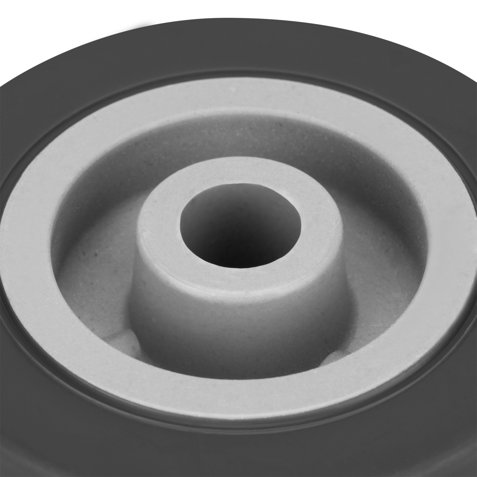 - Универсальность — контактная поверхность выполнена из термопластичной серой резины, поэтому колесо может применяться на различных покрытиях, долгое время сохраняя рабочие качества.
