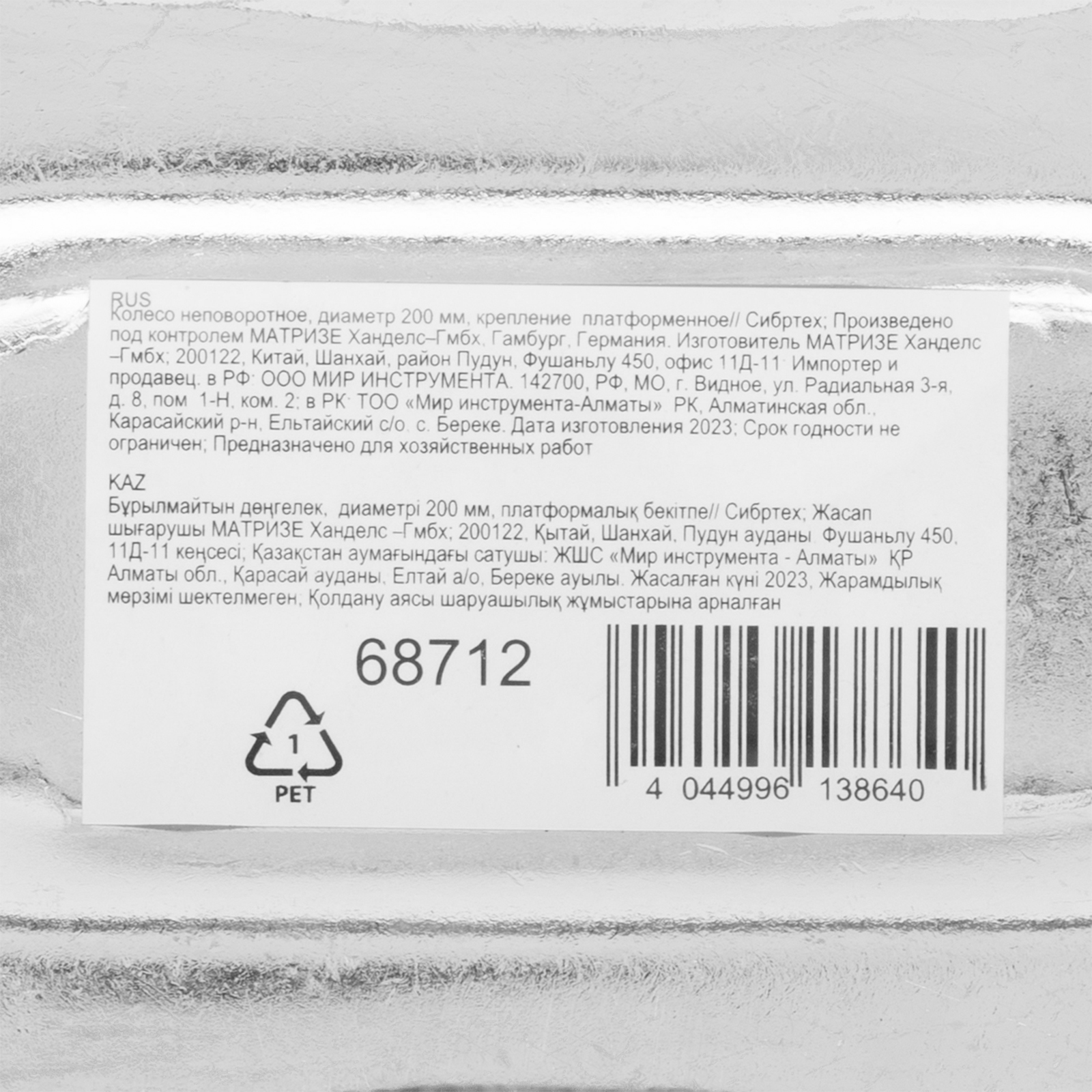 Колесо неповоротное D 200 мм, крепление платформенное Сибртех в Москве