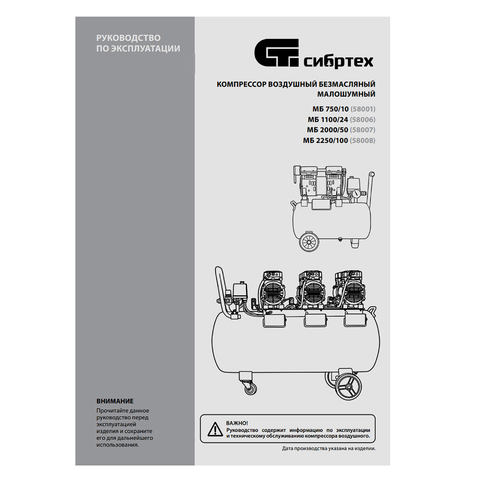 Компрессор безмаслянный малошумный МБ 2250/100, 2250 Вт, 100л, 400 л/мин Сибртех в Москве