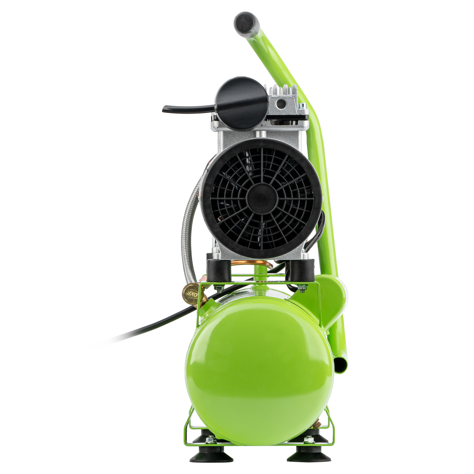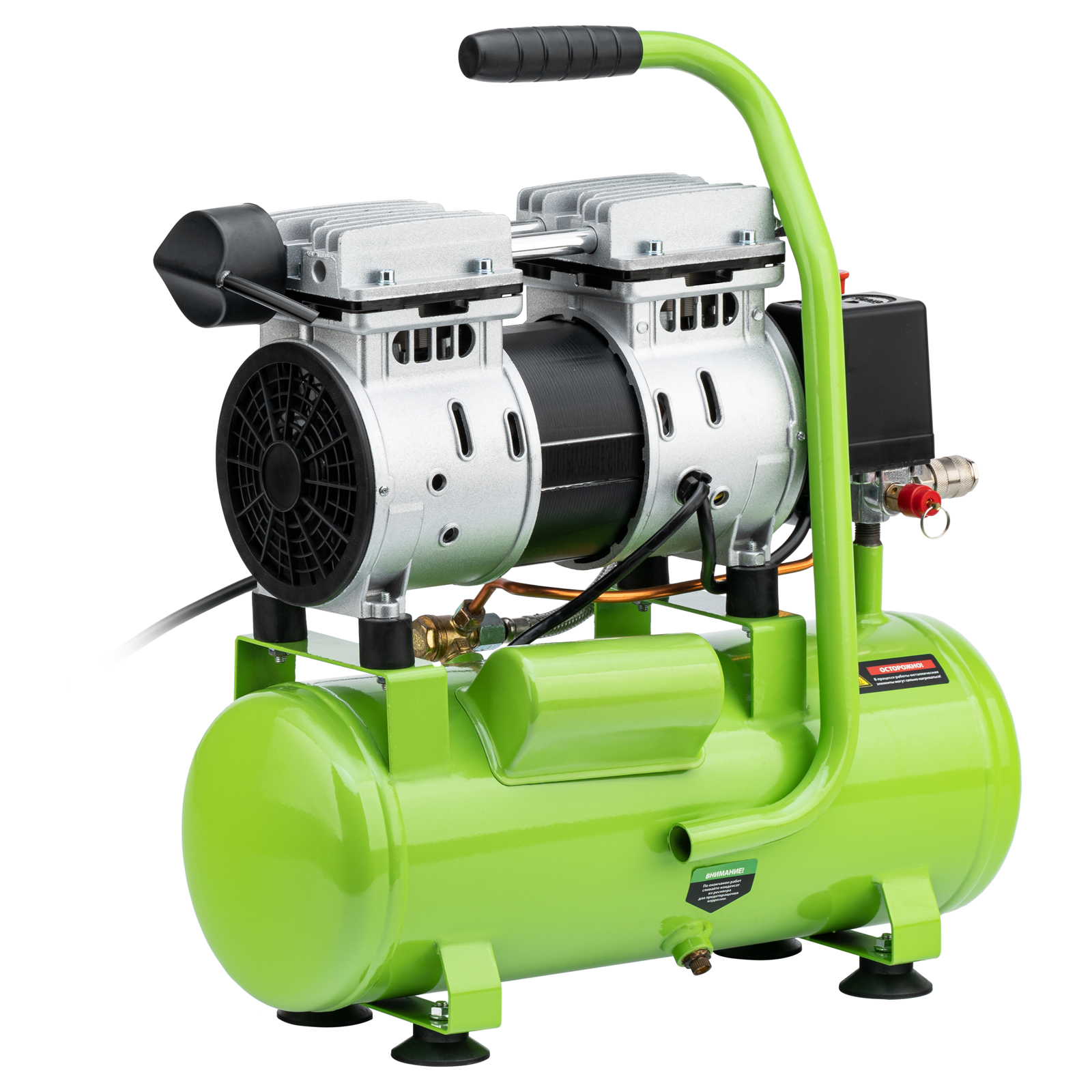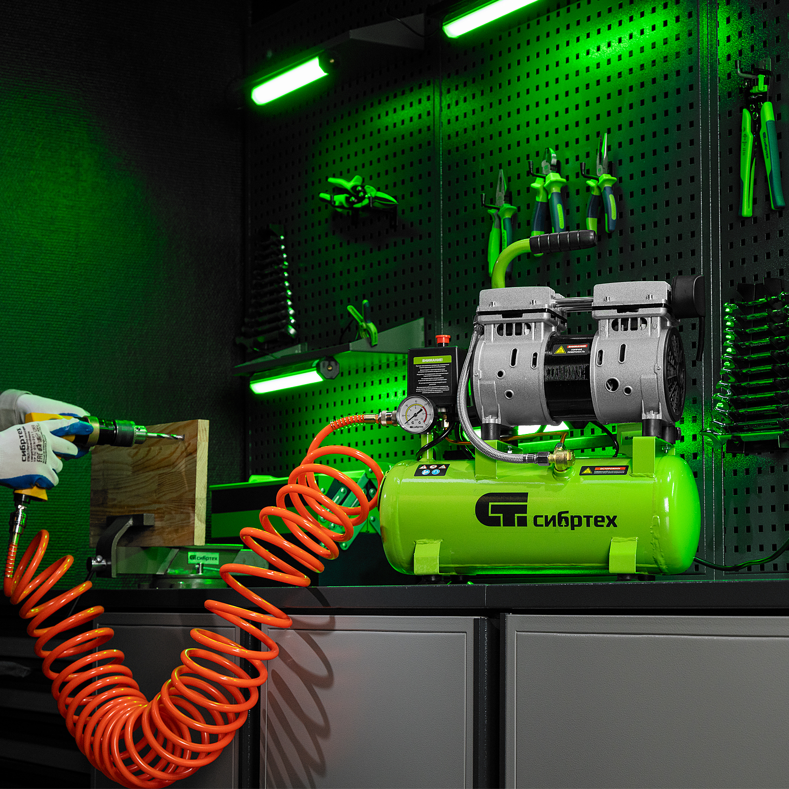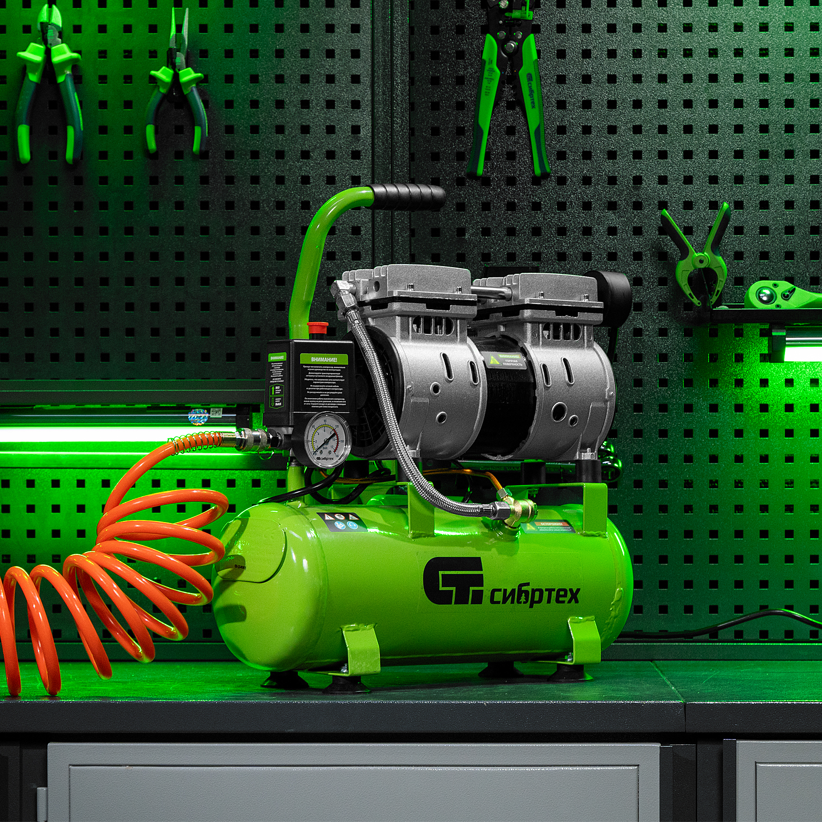 Безмасляный малошумный компрессор Сибртех МБ 750/10 58001 мощностью 750 Вт и объемом ресивера 10 л имеет производительность на входе 150 л/мин и сжимает воздух под давлением до 8 бар. Используется для обеспечения функционирования пневмоинструмента, например, краскораспылителя или пневматического шуруповерта. Для работы устройства не требуется масло, поэтому воздух на выходе не содержит его частиц. Компрессор оптимален для проведения покрасочных работ и продувки электронных компонентов.,Одна из ключевых особенностей компрессора — низкий уровень шума (в районе 65 дБ), позволяющий использовать устройство в жилом помещении без дискомфорта для людей.