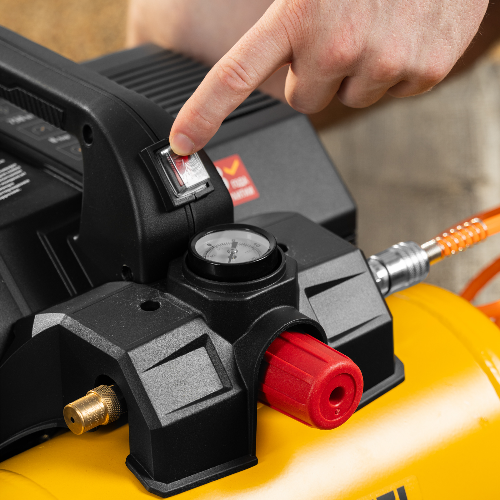 - Удобный контроль давления в ресивере — на компрессор установлен механический манометр, «смотрящий» вверх, поэтому для снятия показаний не нужно присаживаться.