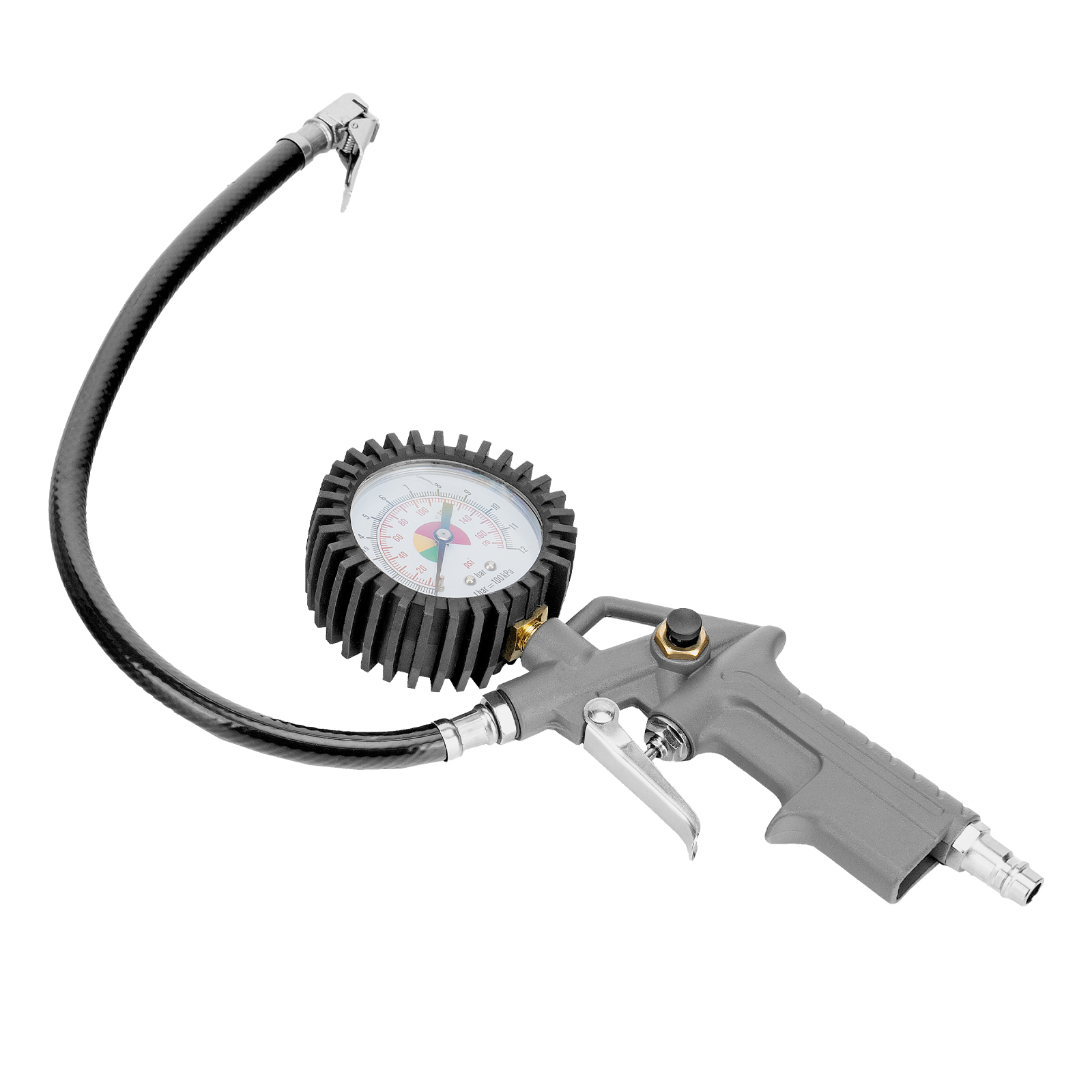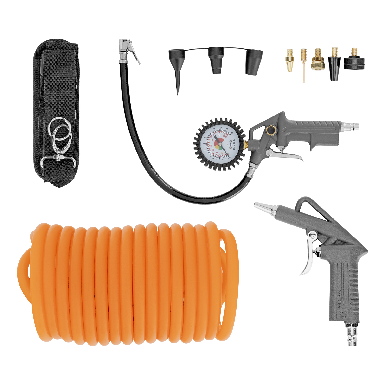 2 манометра_компактный размер_макс рабочее давление 10 бар_набор пневмоинструмента и переходников в комплекте_защита мотора от перегрева
