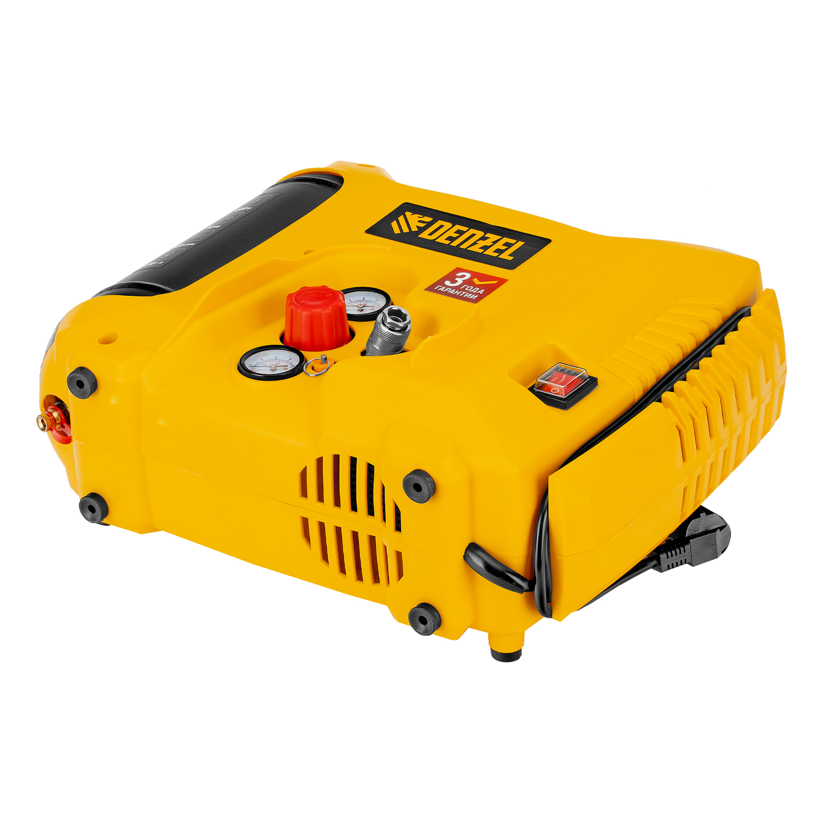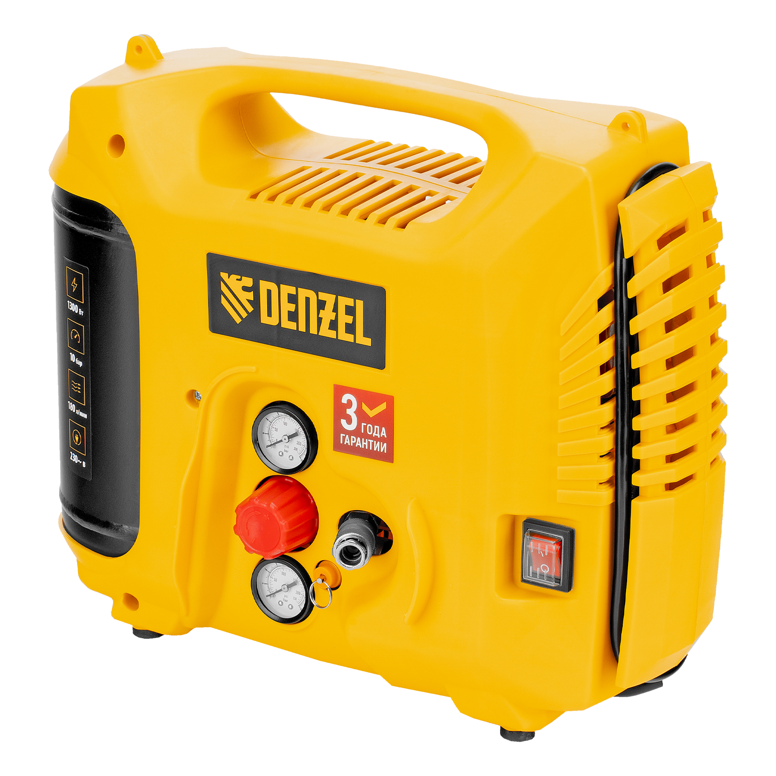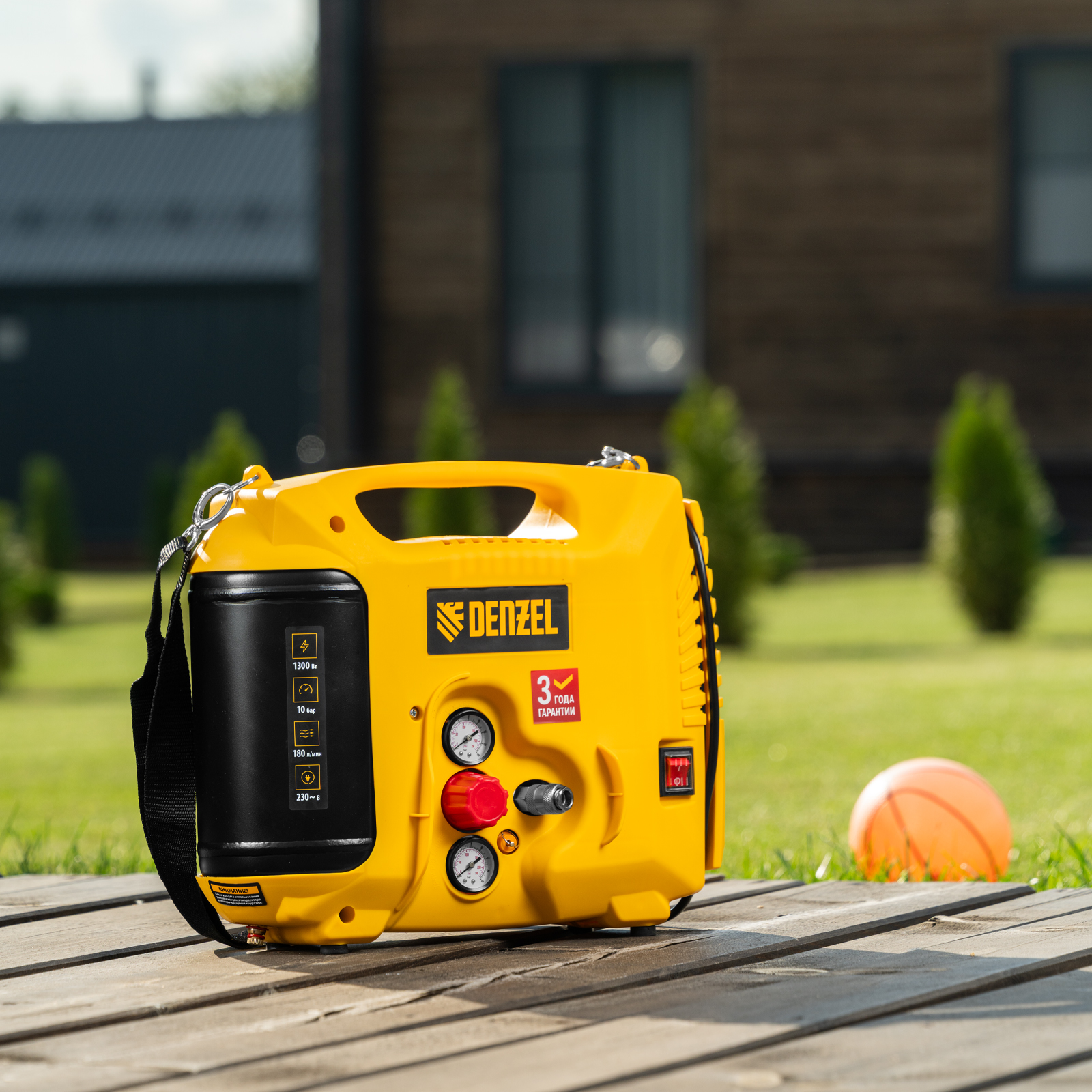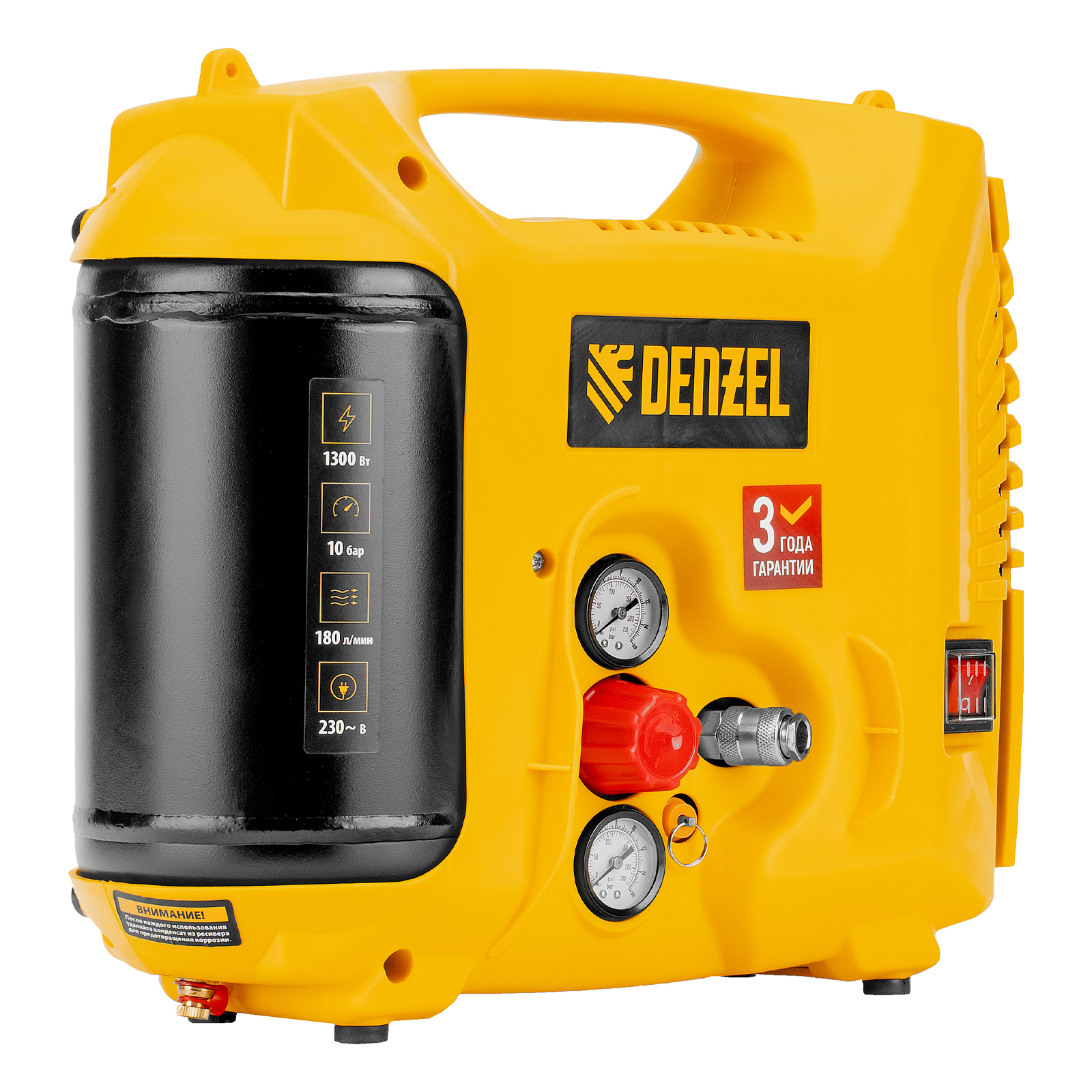 • Ресивер объемом 5 л — несмотря на портативное исполнение, устройство накапливает достаточный запас сжатого воздуха для бесперебойной работы.