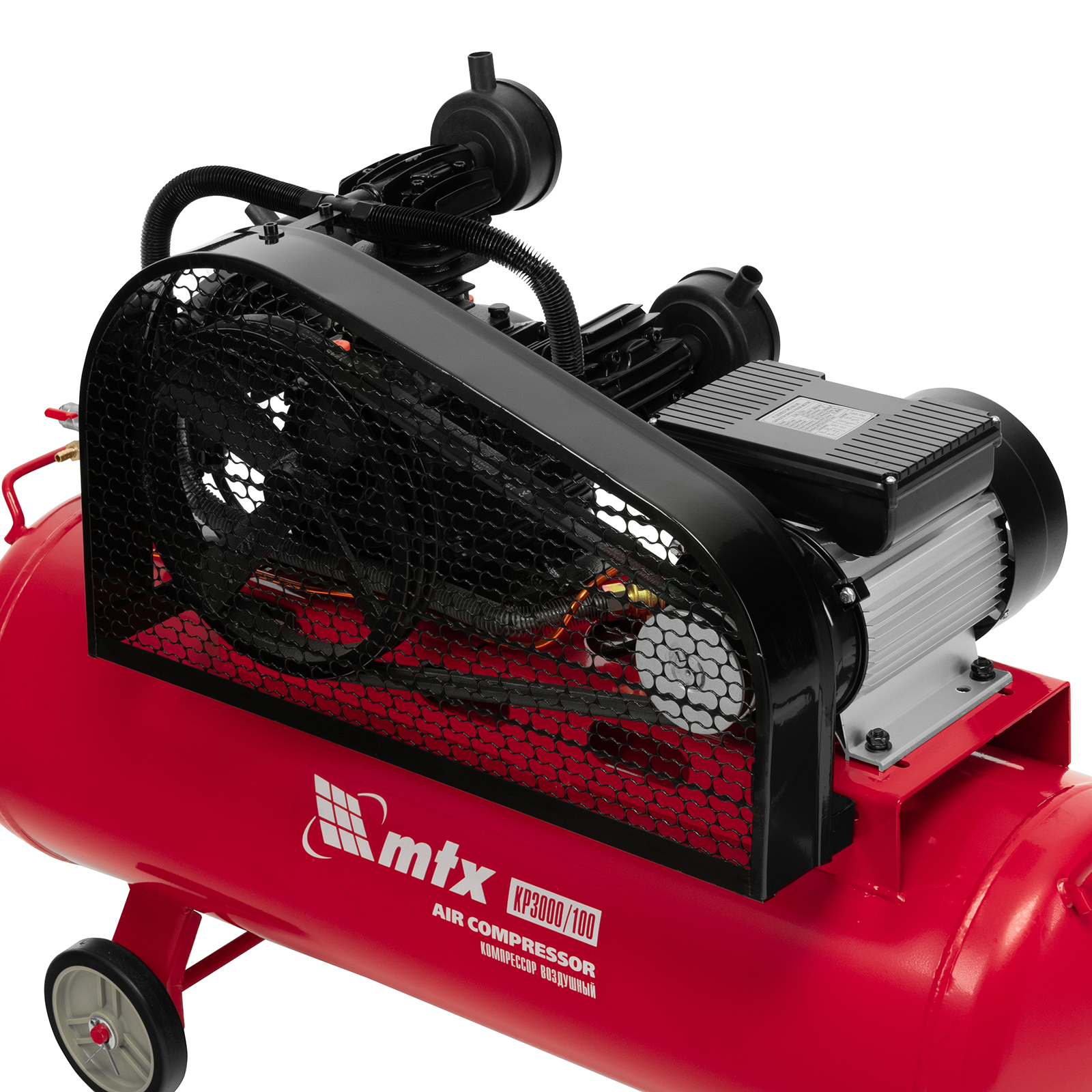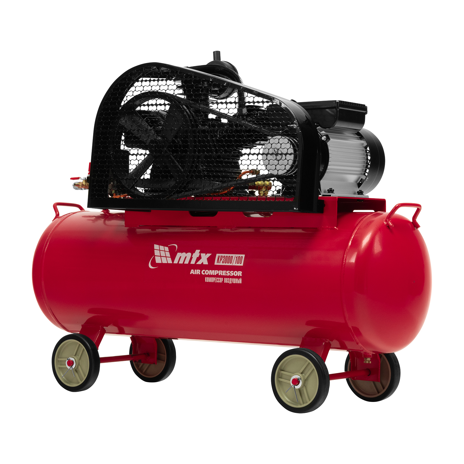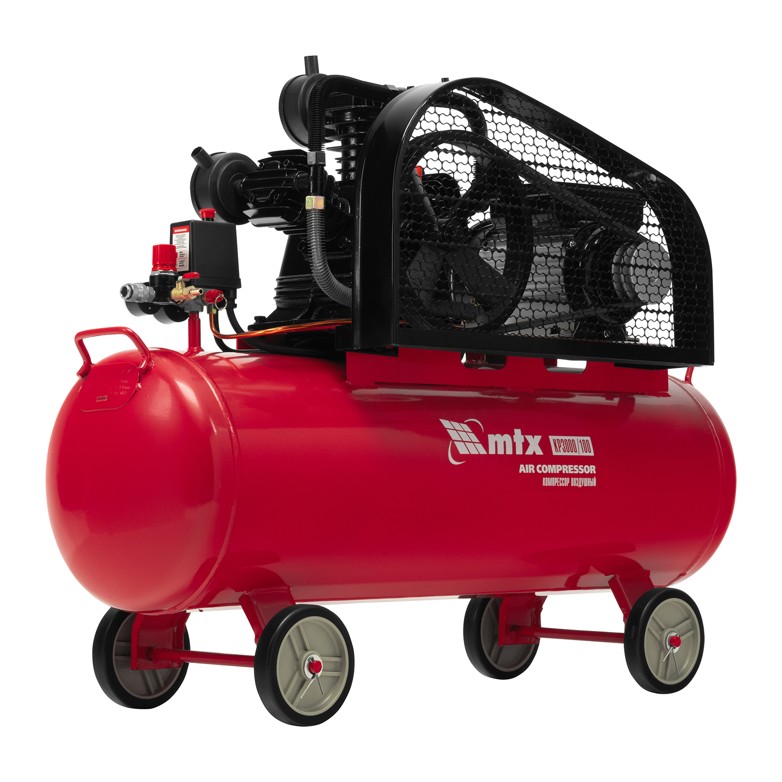 Компрессор воздушный МТХ КР3000/100 58023 с ременным приводом от электродвигателя, мощностью 3,0 кВт и производительностью 510 л/мин, с ресивером объемом 100 литров, применяется для подачи сжатого атмосферного воздуха к пневматическому инструменту. К нему можно подключить гайковерт, дрель, углошлифовальную машину, степлер, краскопульт, продувочный пистолет или другой пневмоинструмент. Для подключения предусмотрены 2 штуцера: быстросъемный и «елочка». Компрессор подходит для профессионального использования на предприятии автосервиса, строительной площадке, в мастерской.