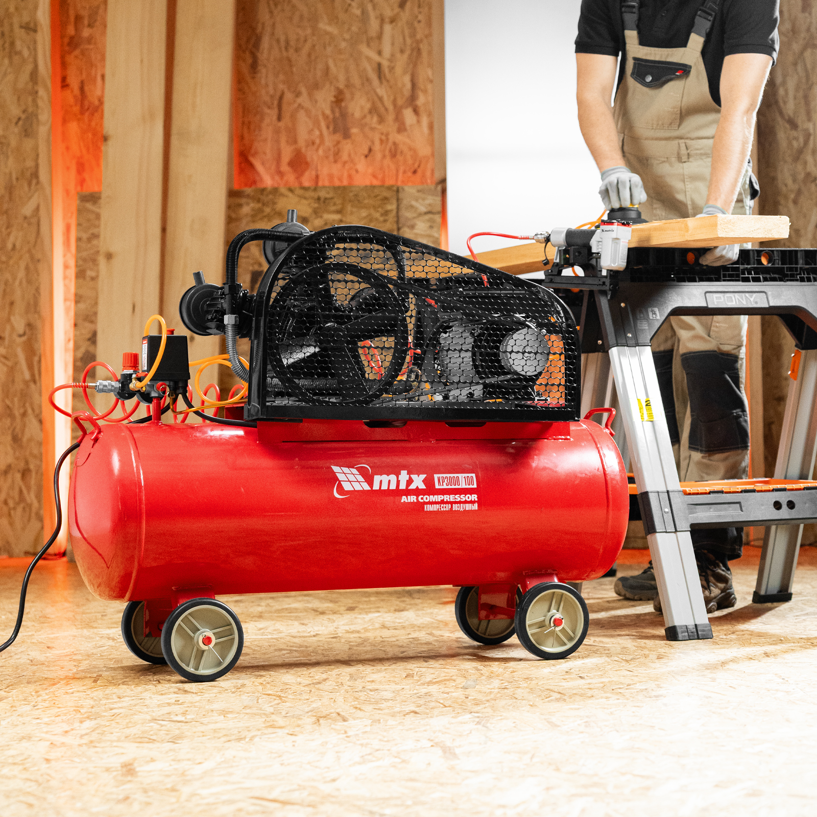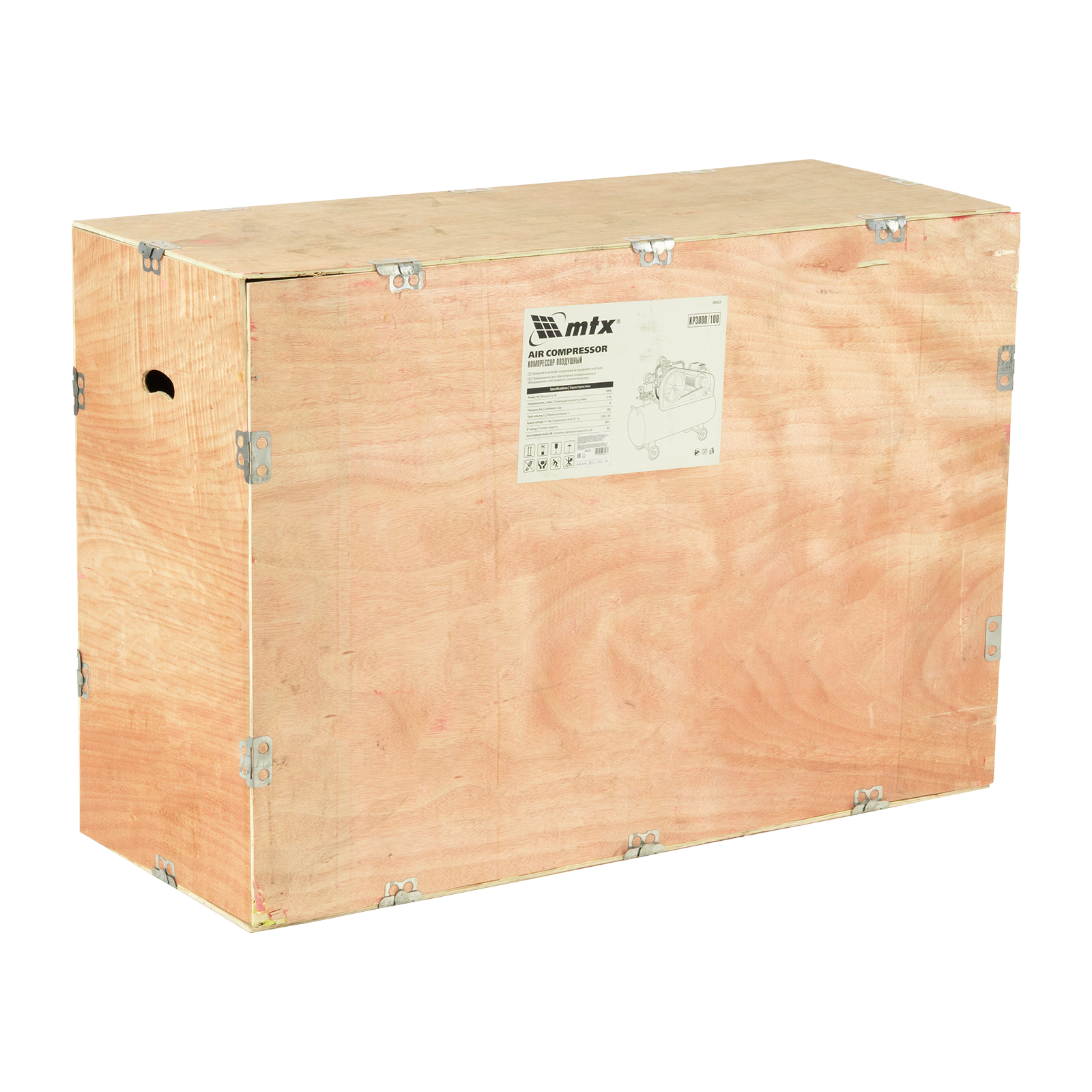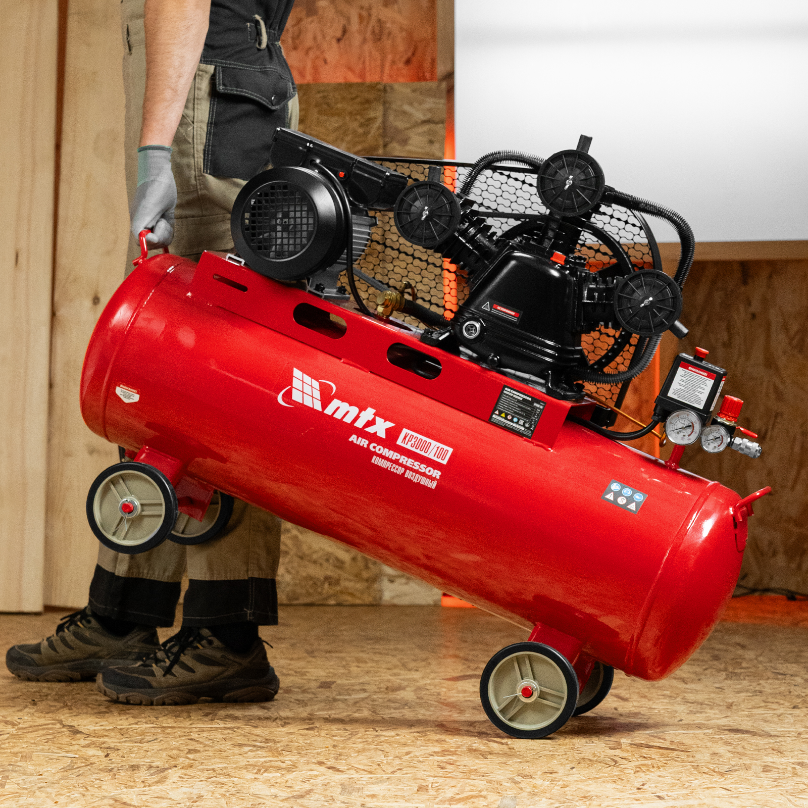 Компрессор воздушный МТХ КР3000/100 58023 с ременным приводом от электродвигателя, мощностью 3,0 кВт и производительностью 510 л/мин, с ресивером объемом 100 литров, применяется для подачи сжатого атмосферного воздуха к пневматическому инструменту. К нему можно подключить гайковерт, дрель, углошлифовальную машину, степлер, краскопульт, продувочный пистолет или другой пневмоинструмент. Для подключения предусмотрены 2 штуцера: быстросъемный и «елочка». Компрессор подходит для профессионального использования на предприятии автосервиса, строительной площадке, в мастерской.