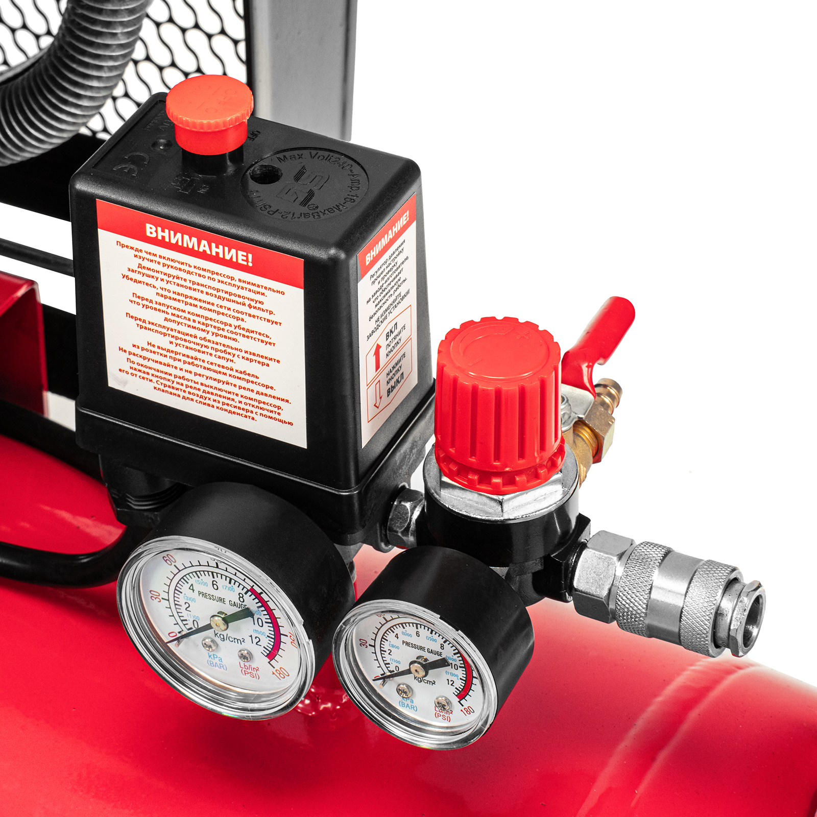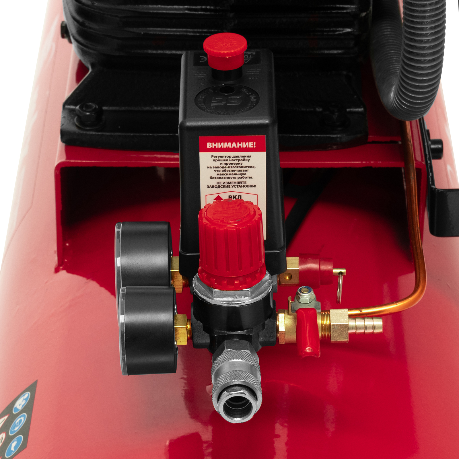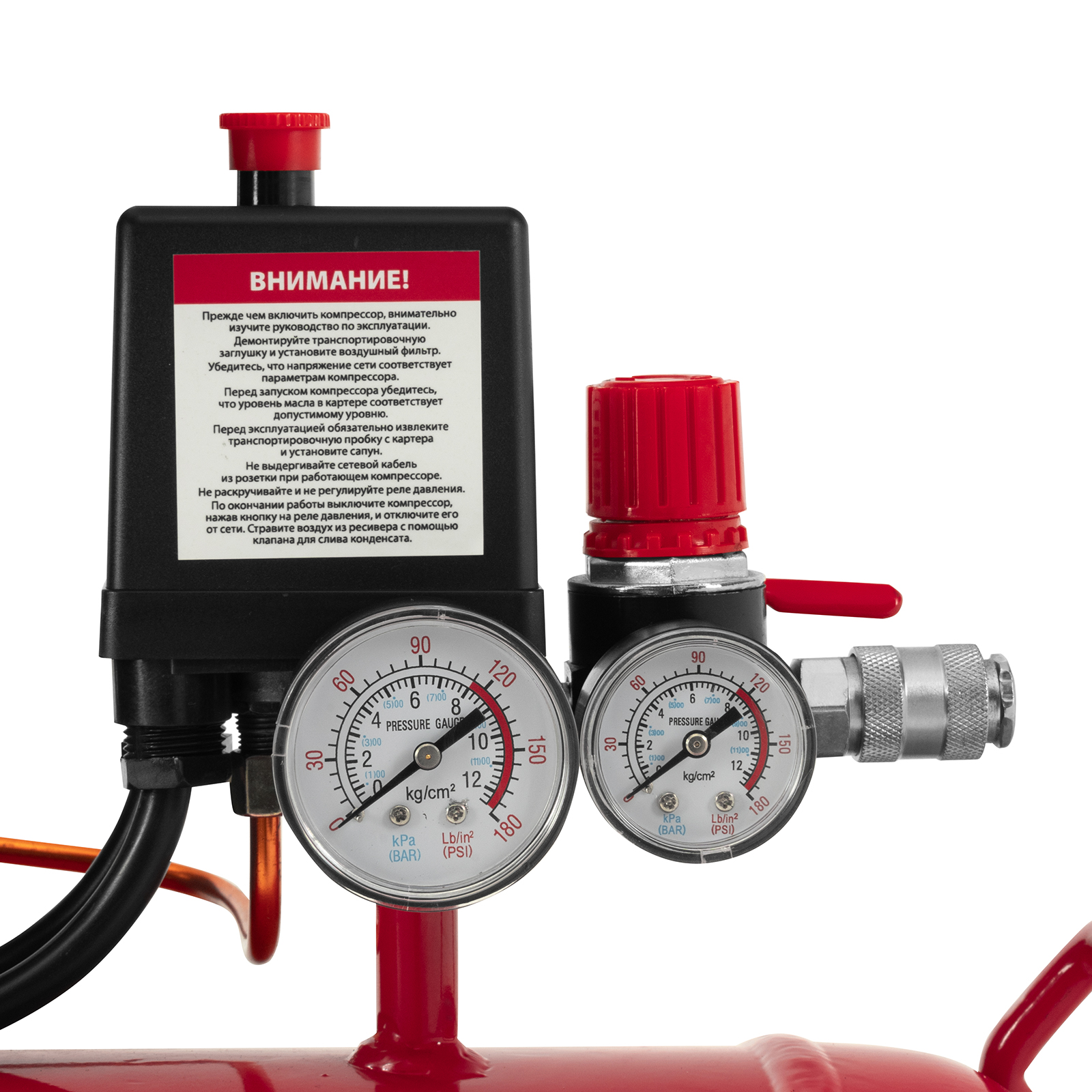 - Автоматическая регулировка производительности — прессостат останавливает двигатель при достижении максимального рабочего давления (8 бар) и запускает его при падении давления ниже минимально допустимого уровня.